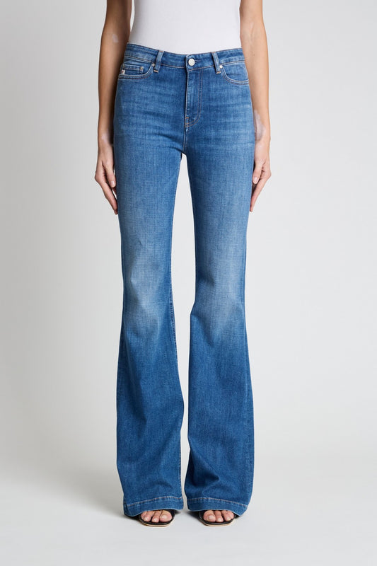 Hourglass silhouette with a fitted upper block and wide, kicked-out hems.