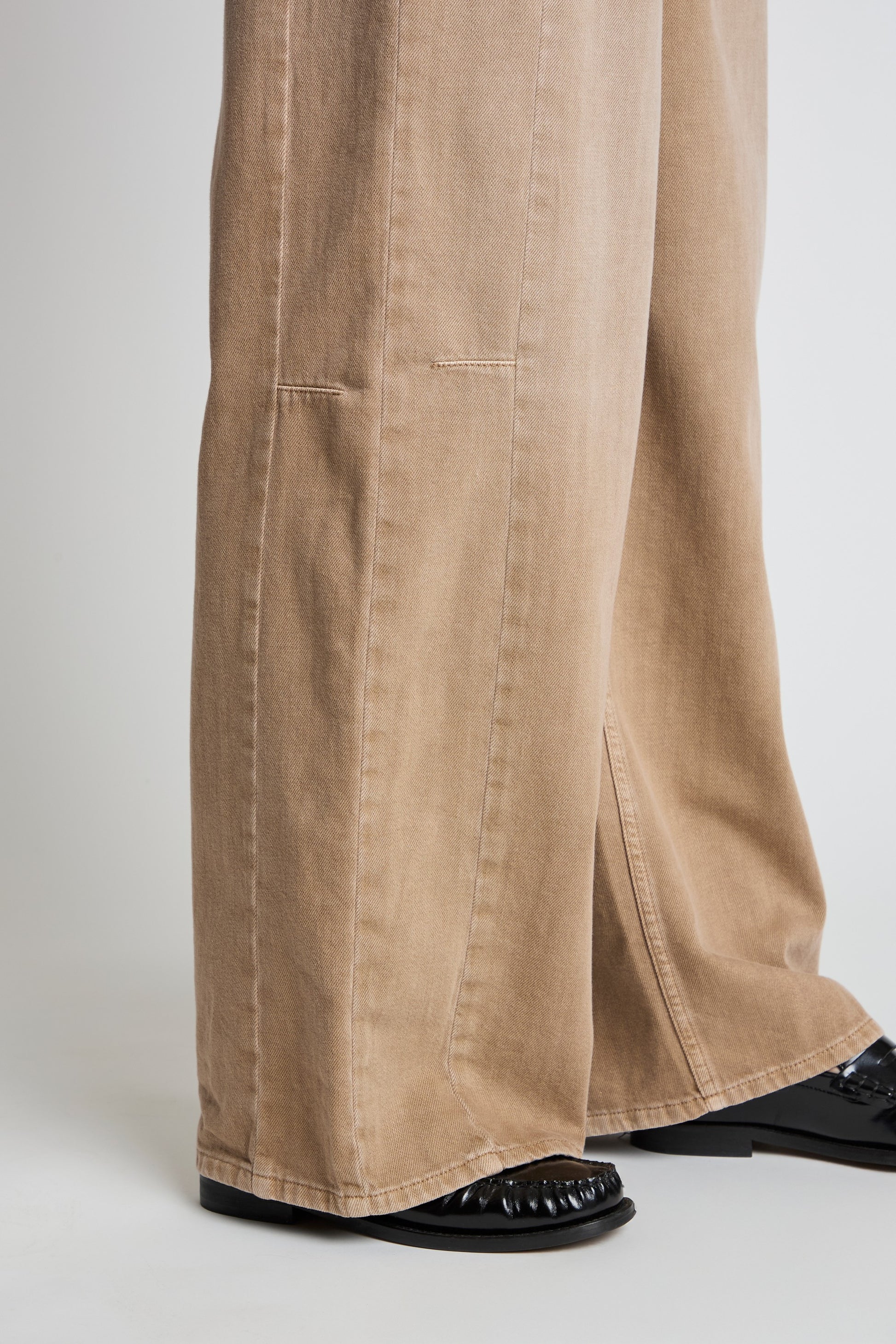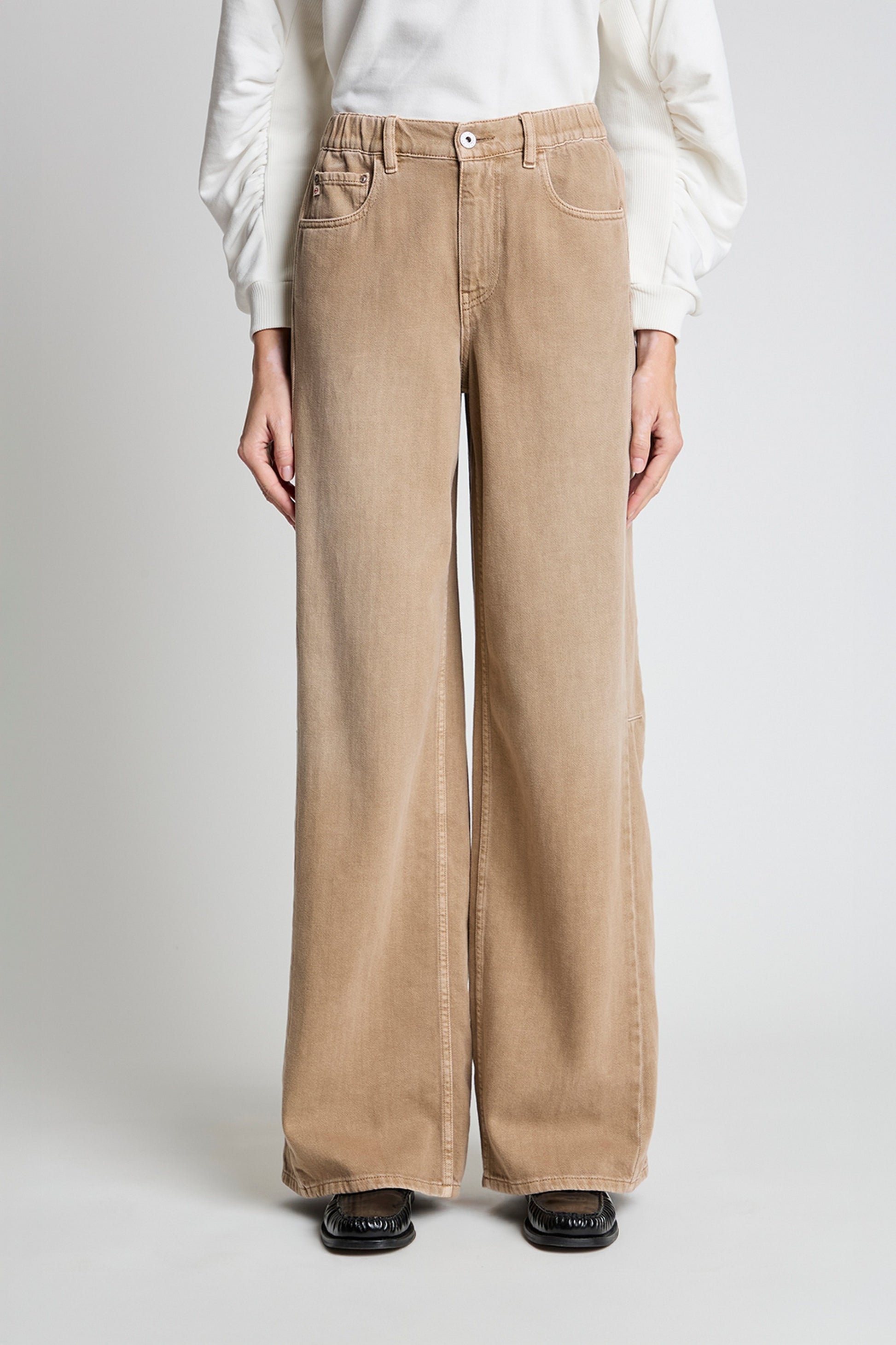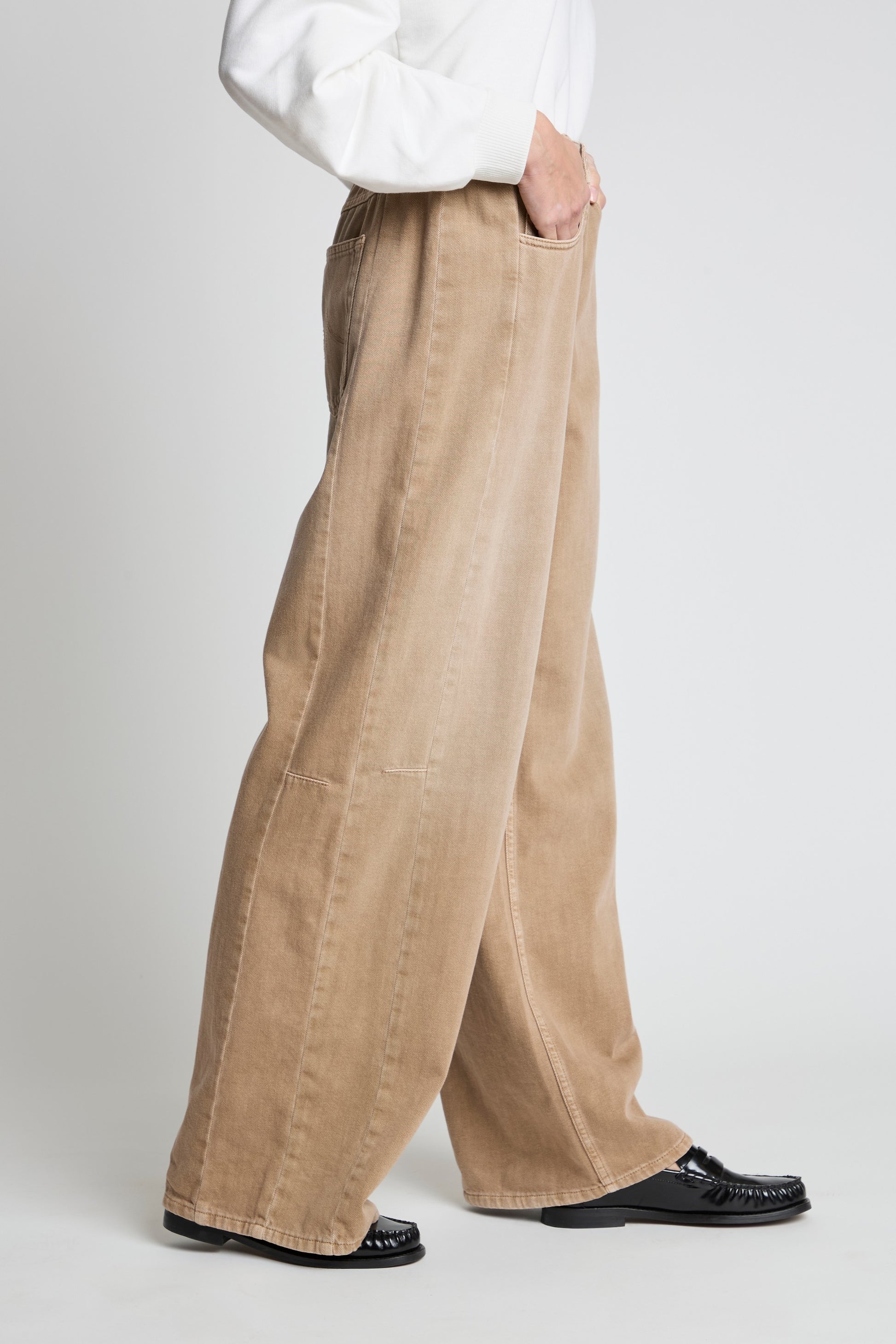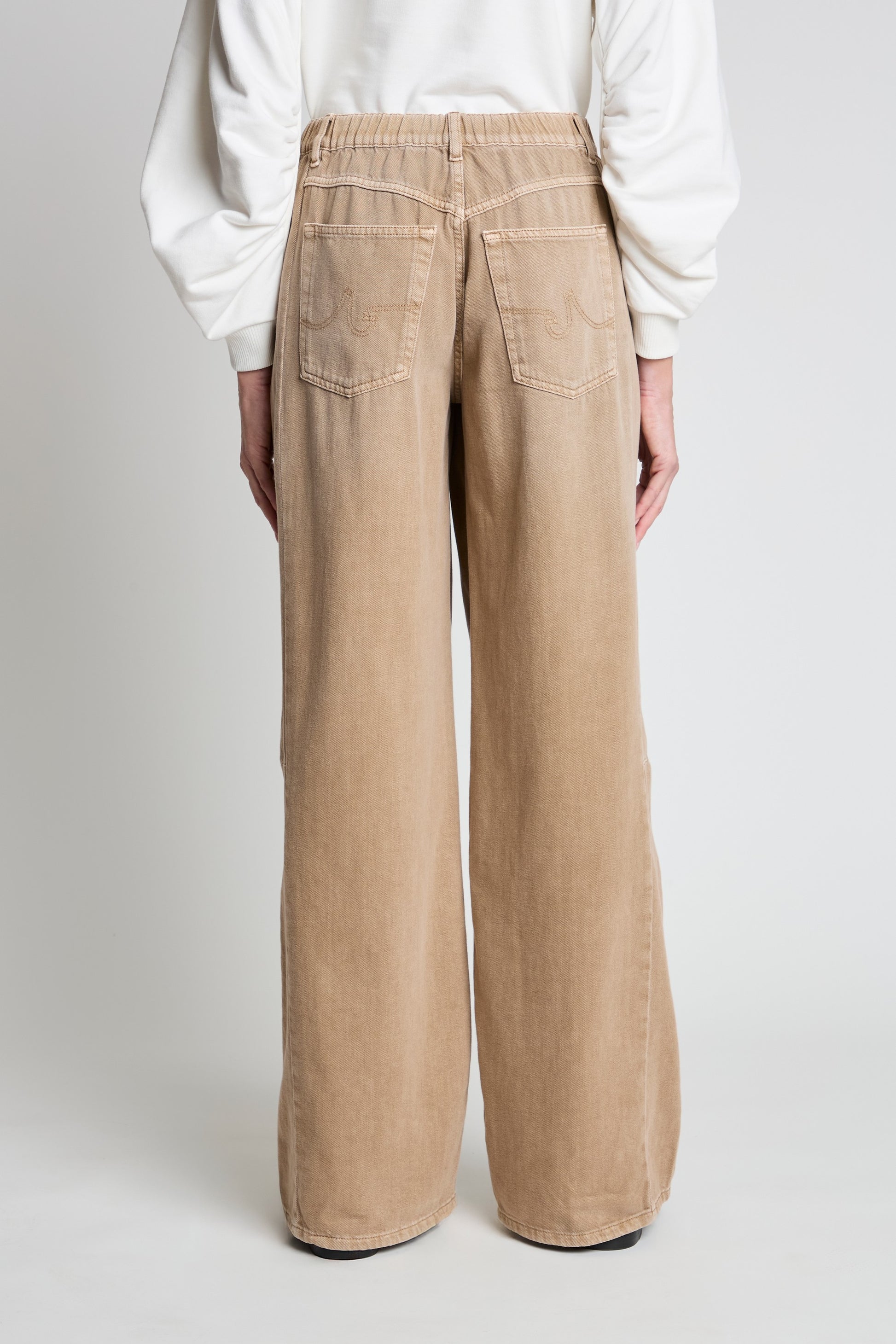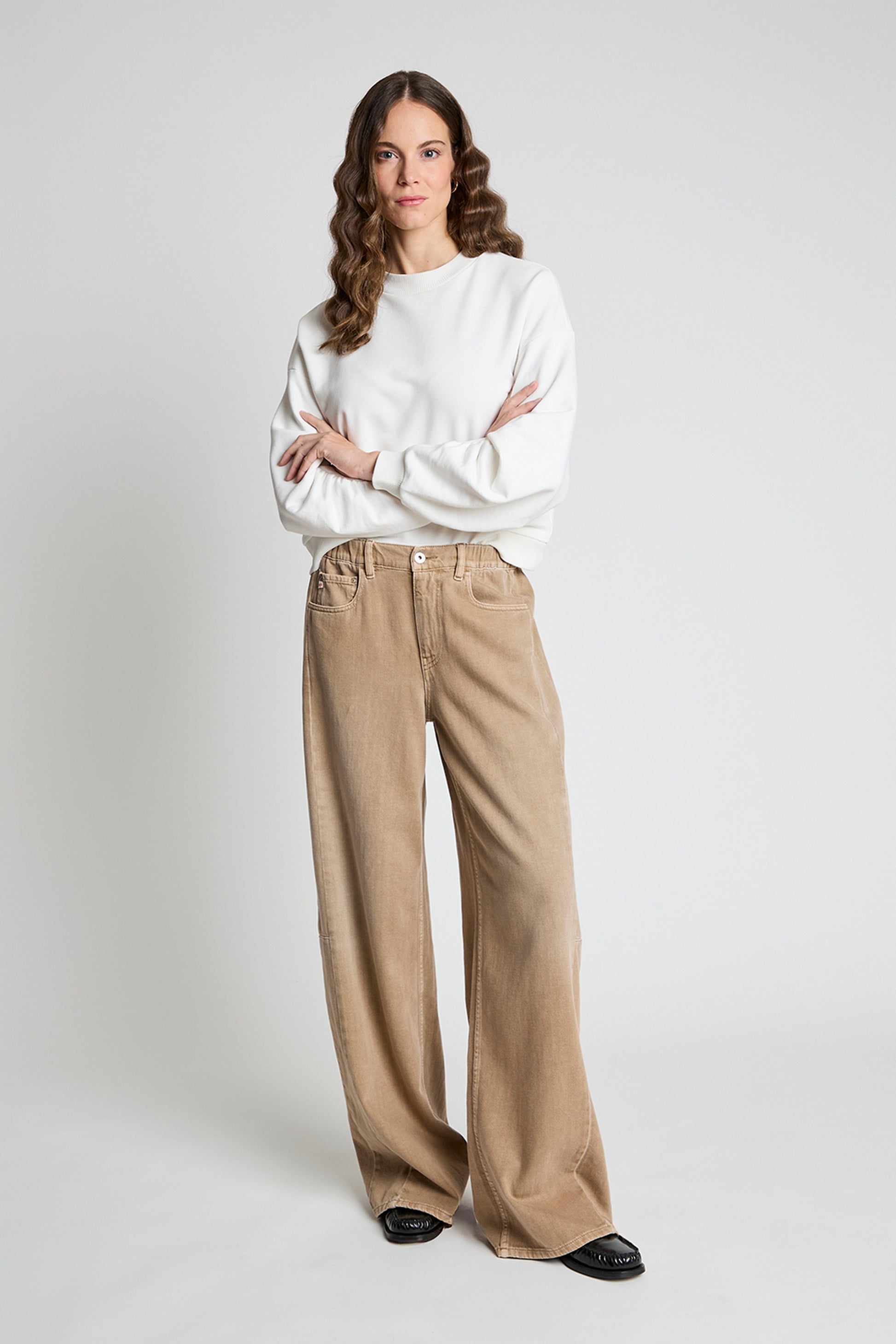 Duna is a mid-rise barrel-leg jean with the same sleek silhouette as Jesolo, now featuring an elasticated detail at the back of the waist for added comfort. The relaxed fit through the hips and subtle flare at the hem create a modern, effortless shape