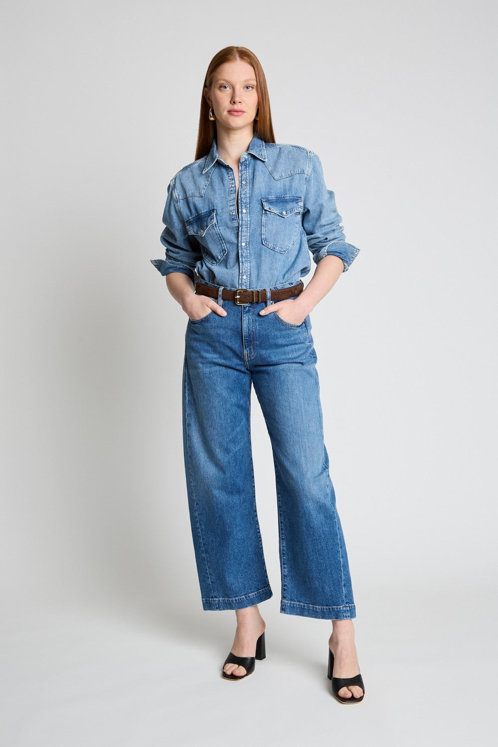 Hattie is a laid-back barrel leg jean with a high rise and an easy, curved shape, finished with side seam paneling. Cropped at the ankle with a wide leg opening, it has classic five-pocket styling and durable construction thats made for everyday wear.