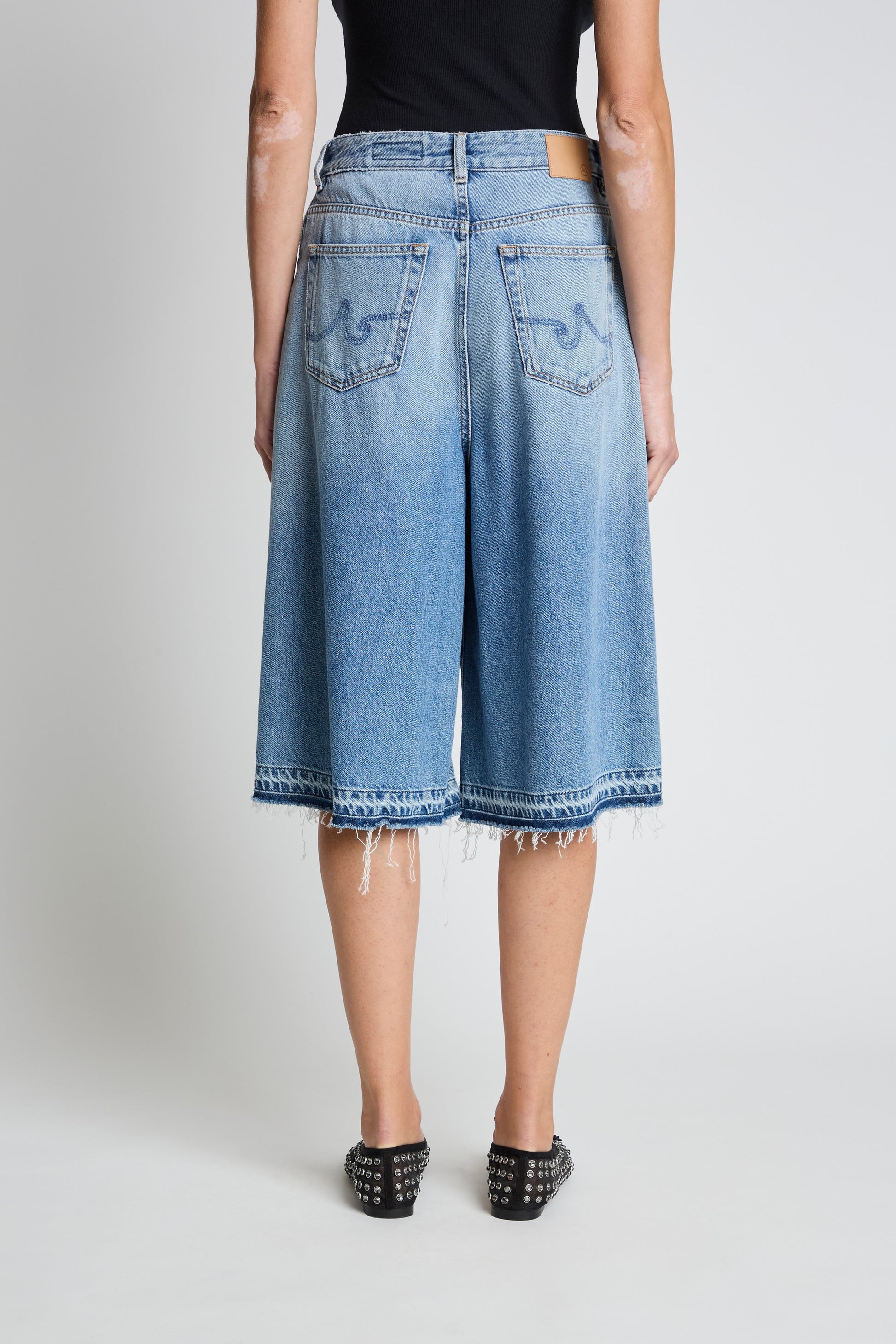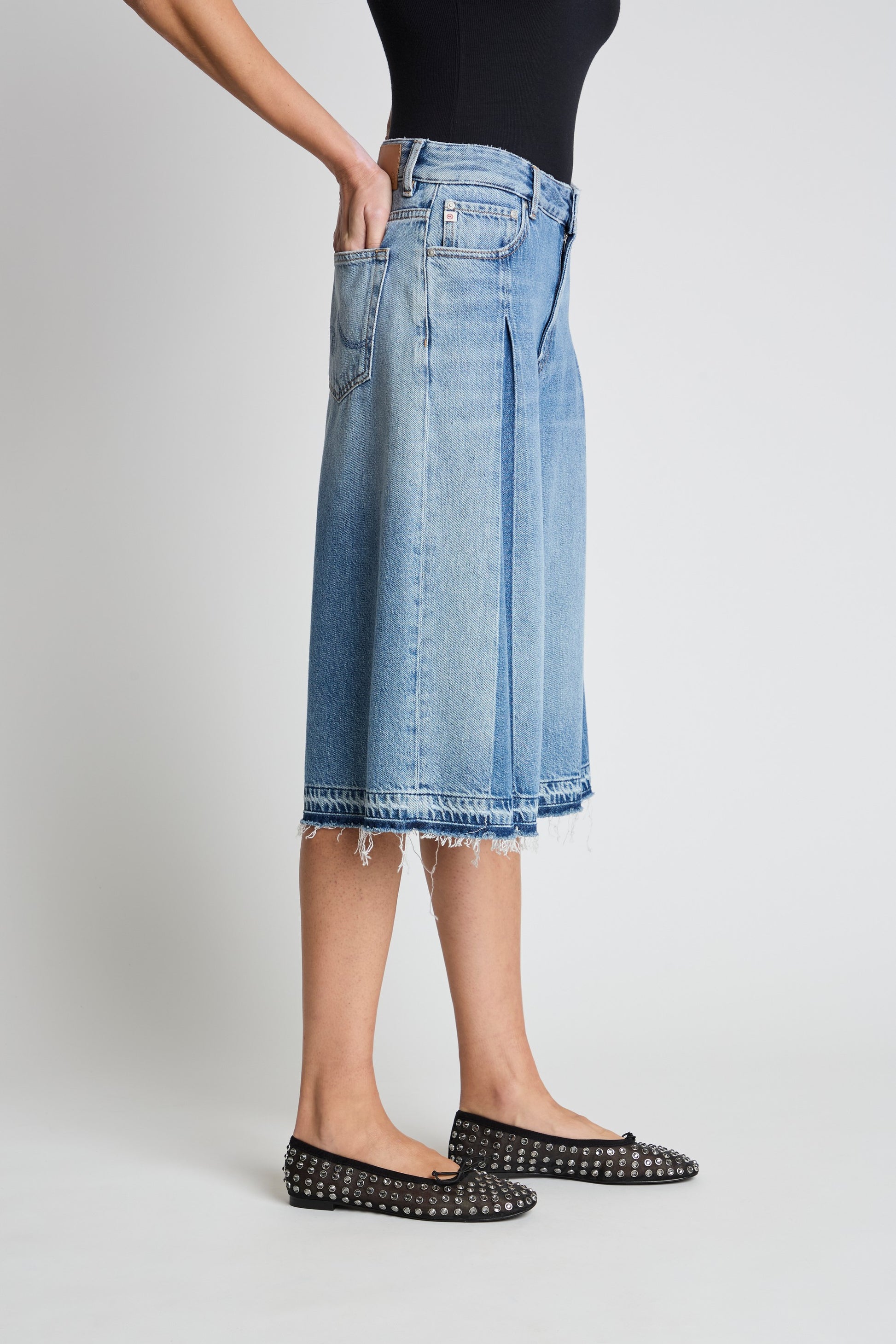The Daphne Coulotte is a high-rise, midi-length denim style with a wide-leg silhouette. Designed with subtle pleated detailing and contrast denim panels for added shape, its finished with an undone raw hem for a relaxed, modern feel.