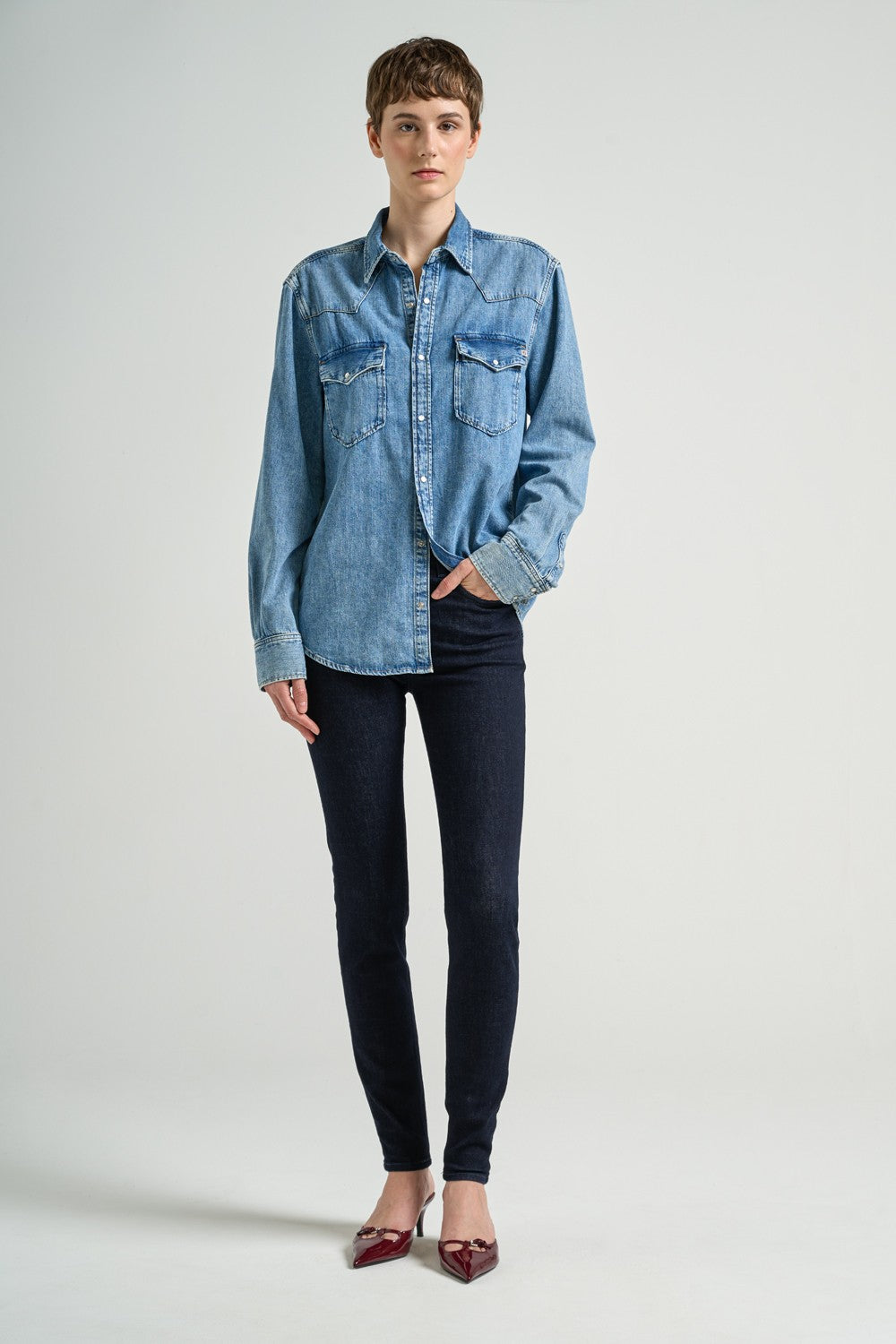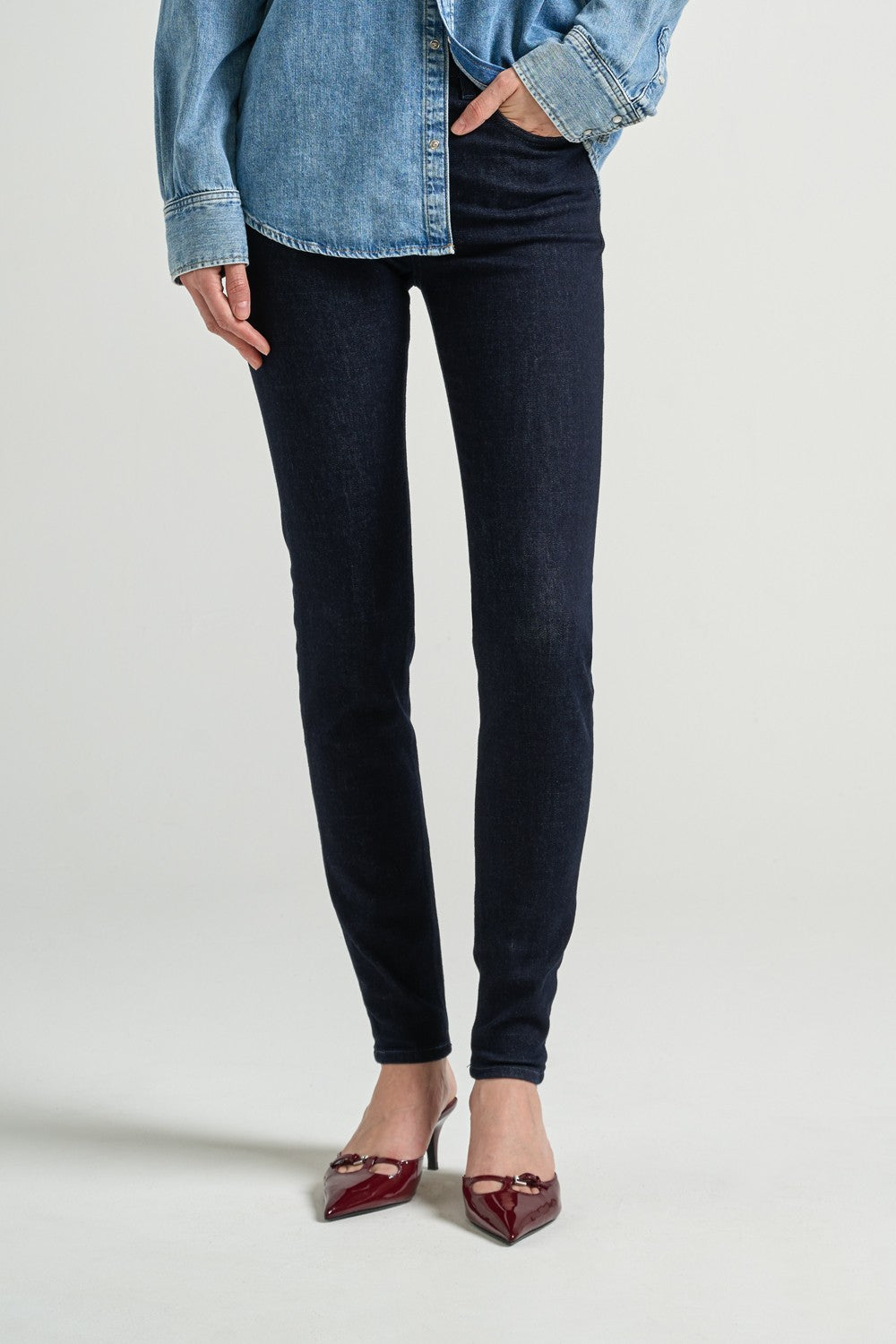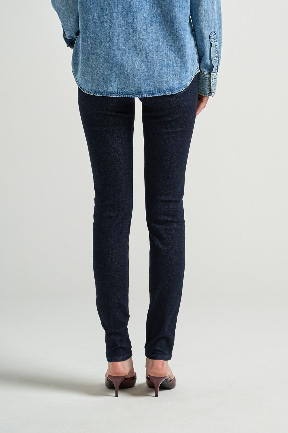 The Geneva jeans feature a high-rise waist and a long skinny fit, offering a sleek and tailored silhouette. Subtle distressed details provide a relaxed, worn-in look, making them a versatile choice for everyday wear.