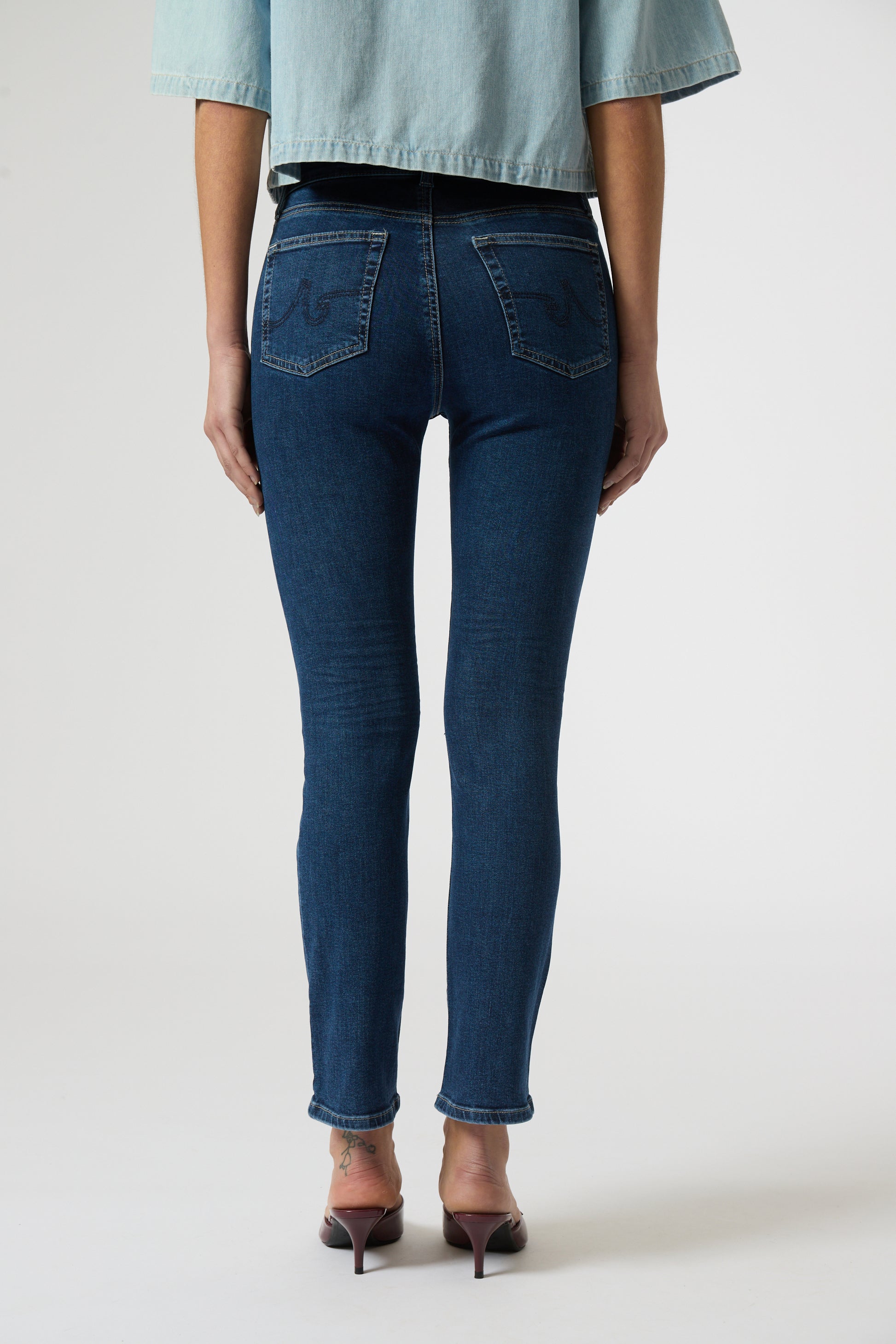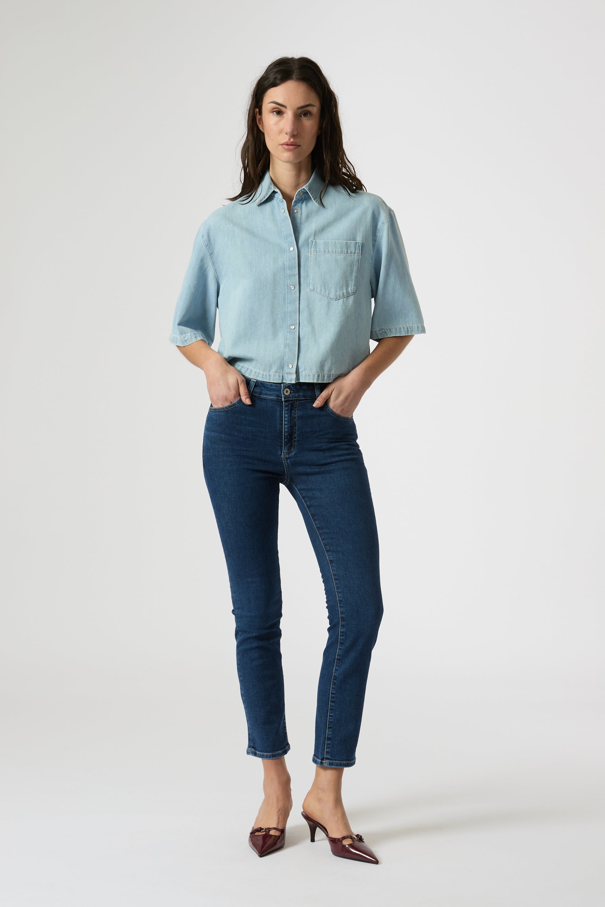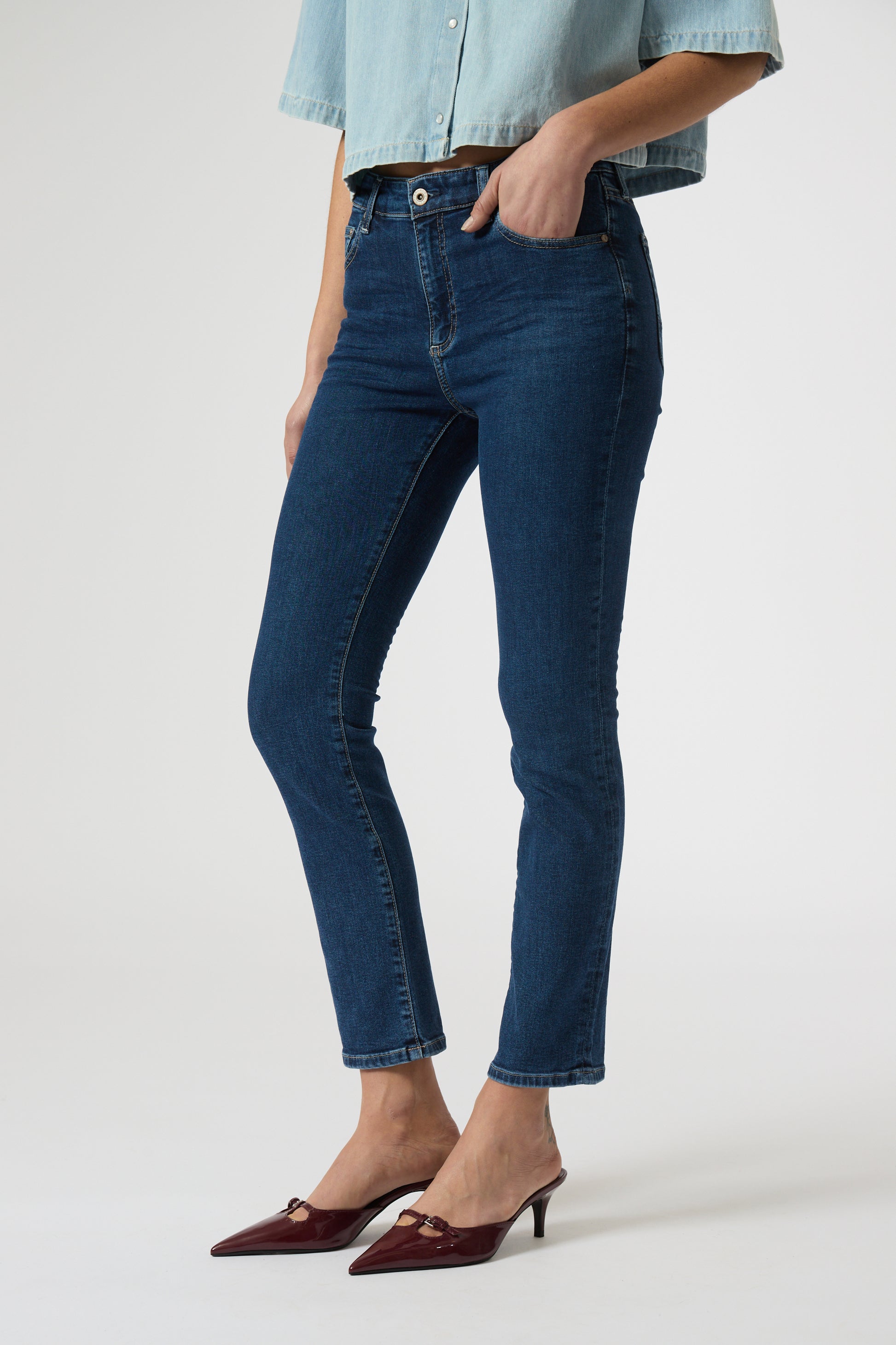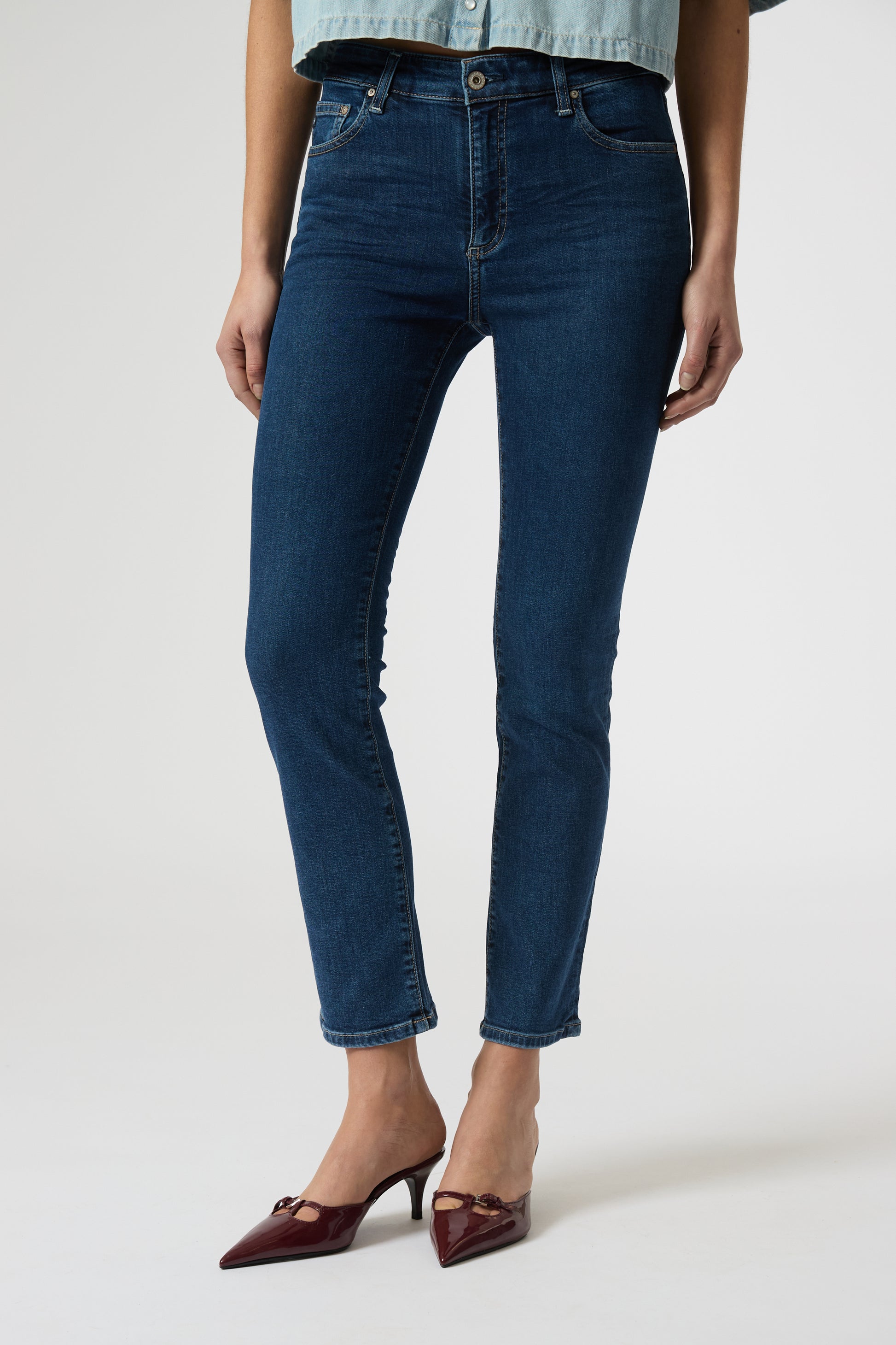 Mari è un jeans gamba dritta a vita media..94% cotone, 5% poliestere elasticizzato, 1% elastan