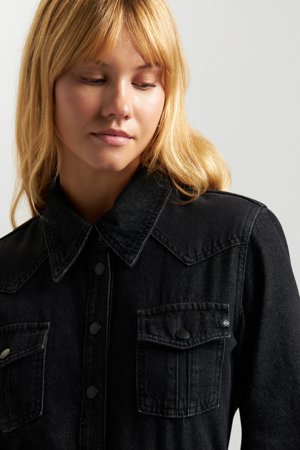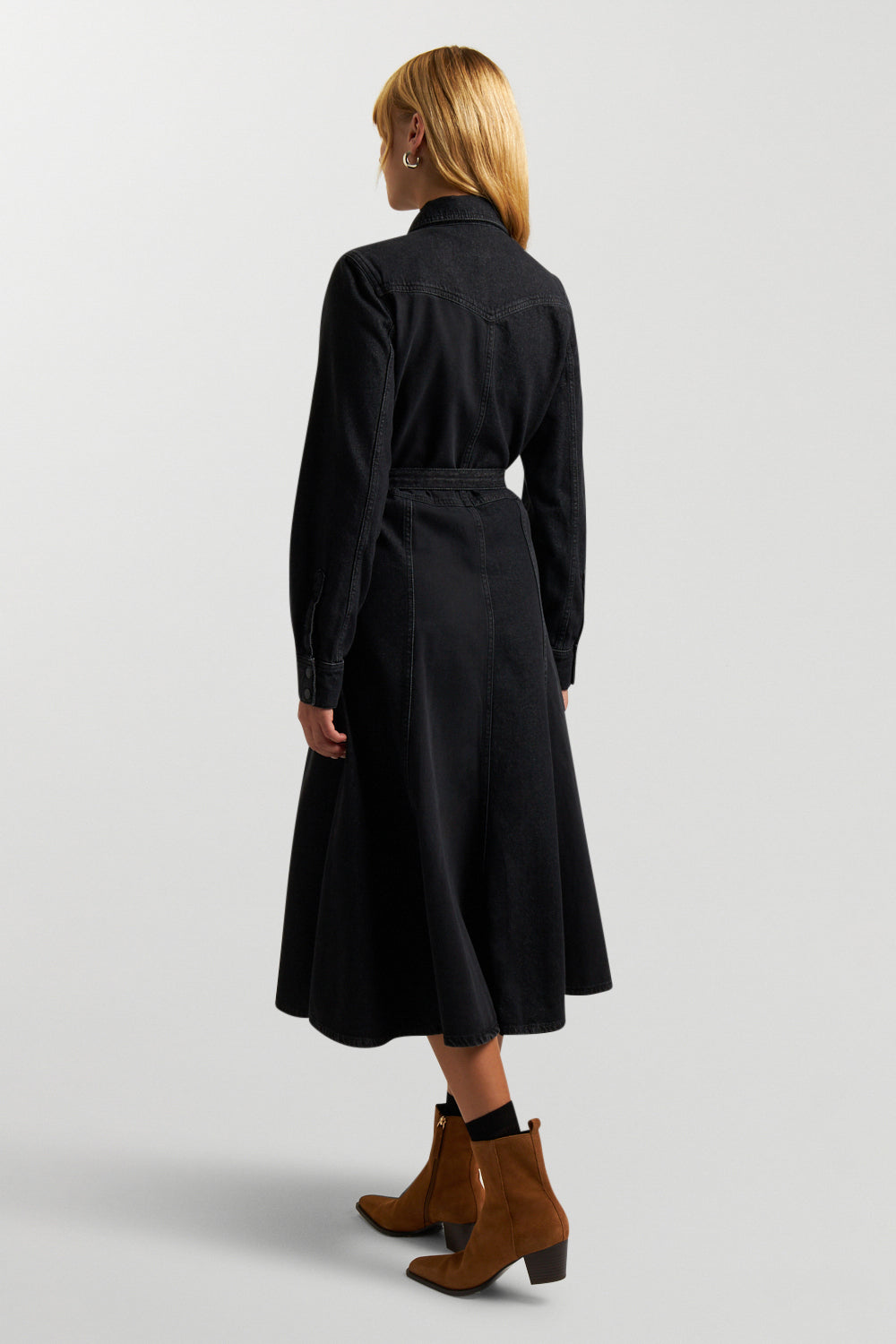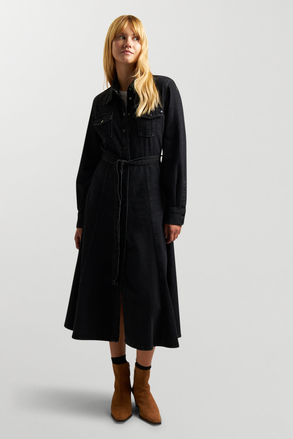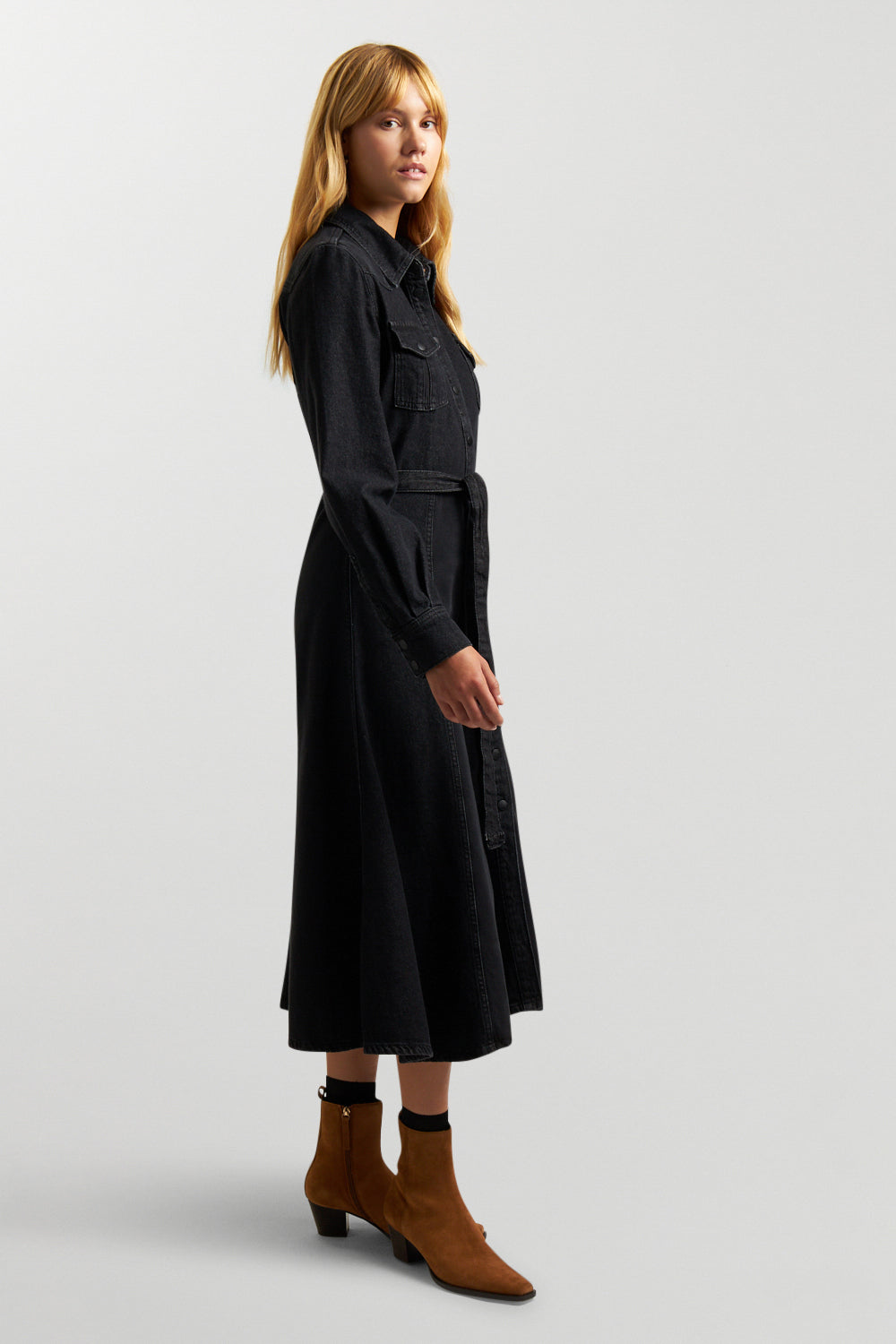 The Marseilles patched denim dress features long sleeves and a midi length, combining a chic and casual style. It includes front pockets for added functionality and a fitted waist with a coordinating belt that accentuates the silhouette. The button-down design adds a touch of sophistication, making this dress perfect for both day and night occasions. Versatile and stylish, it can be easily paired with boots or sneakers for a complete look