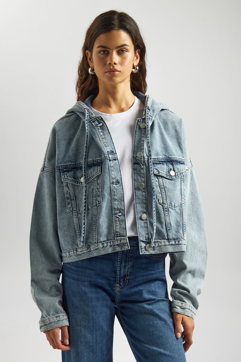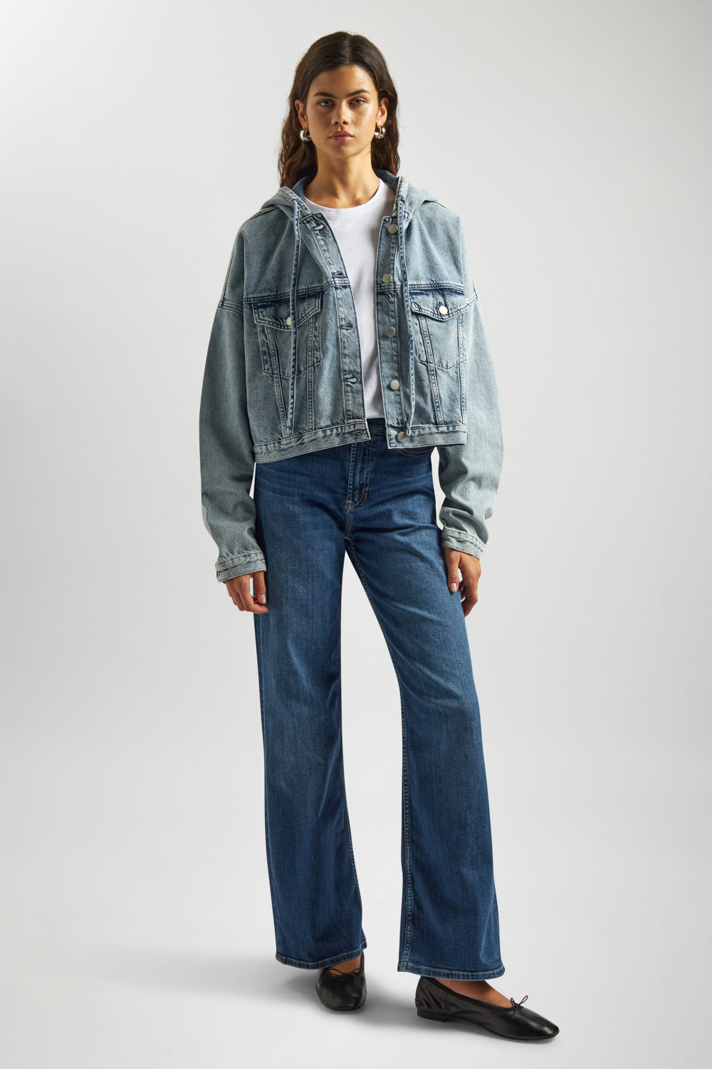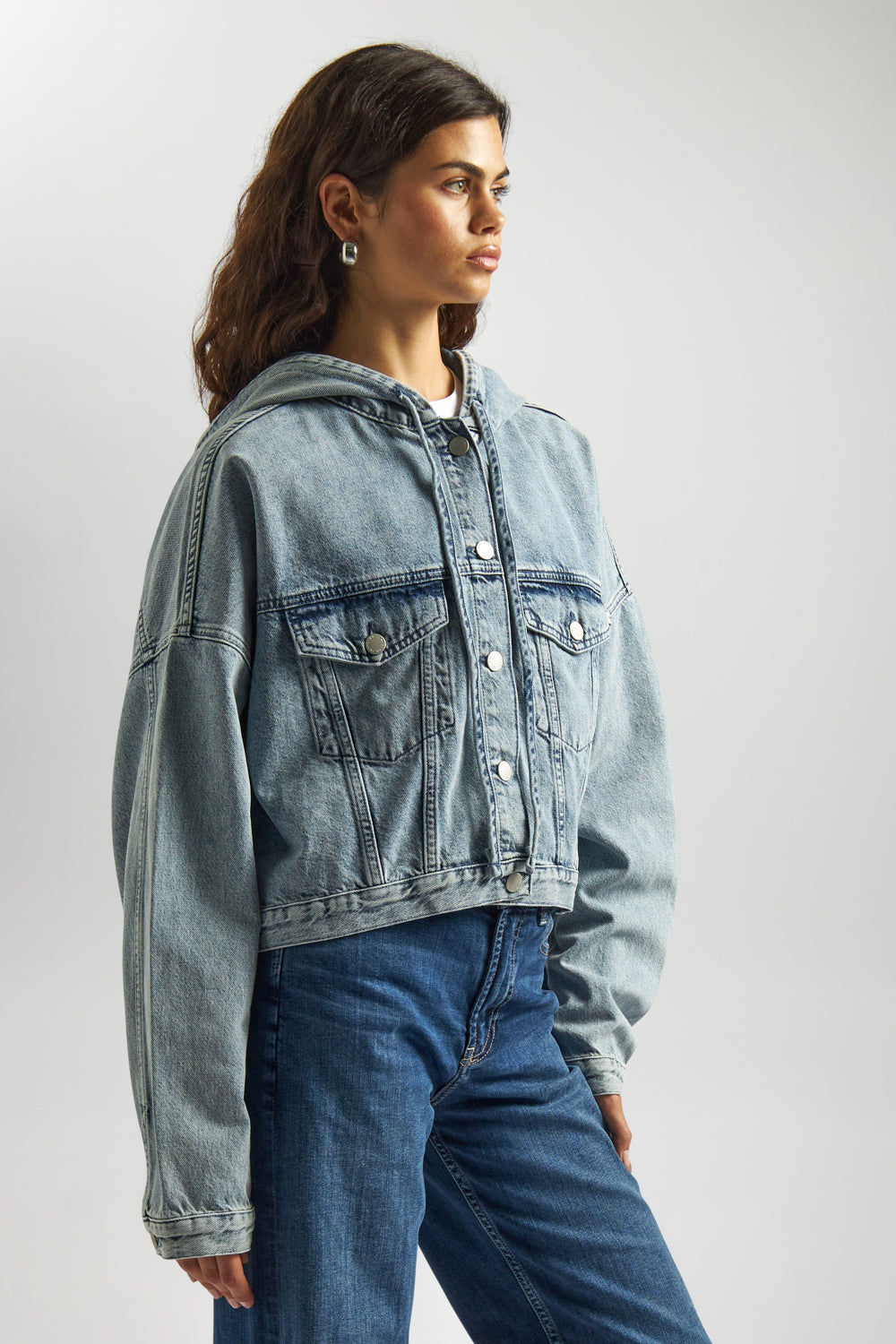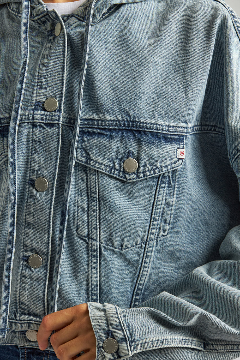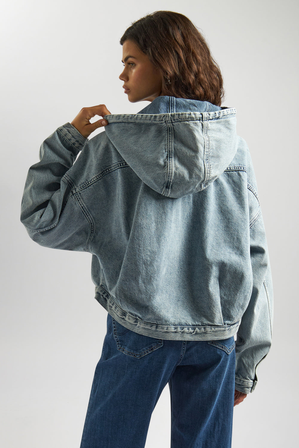 This denim jacket with a hood combines comfort and effortless style. Made from soft denim, it has a roomy silhouette for easy layering. The hood adds a casual touch, making it perfect for transitional weather. The Sherwood hooded jacket is both versatile and chic, ideal for everyday wear or casual outings