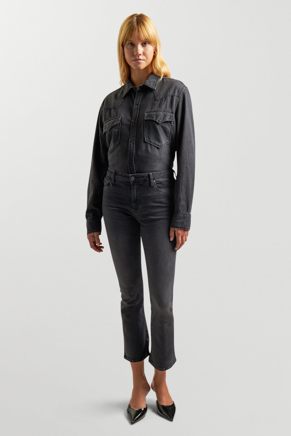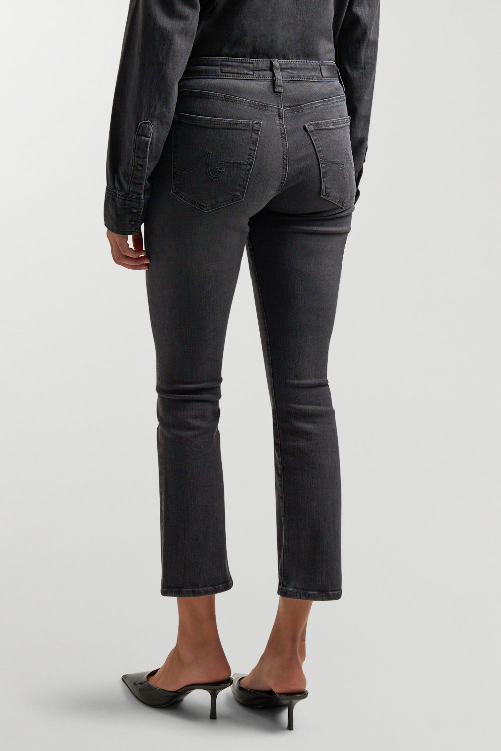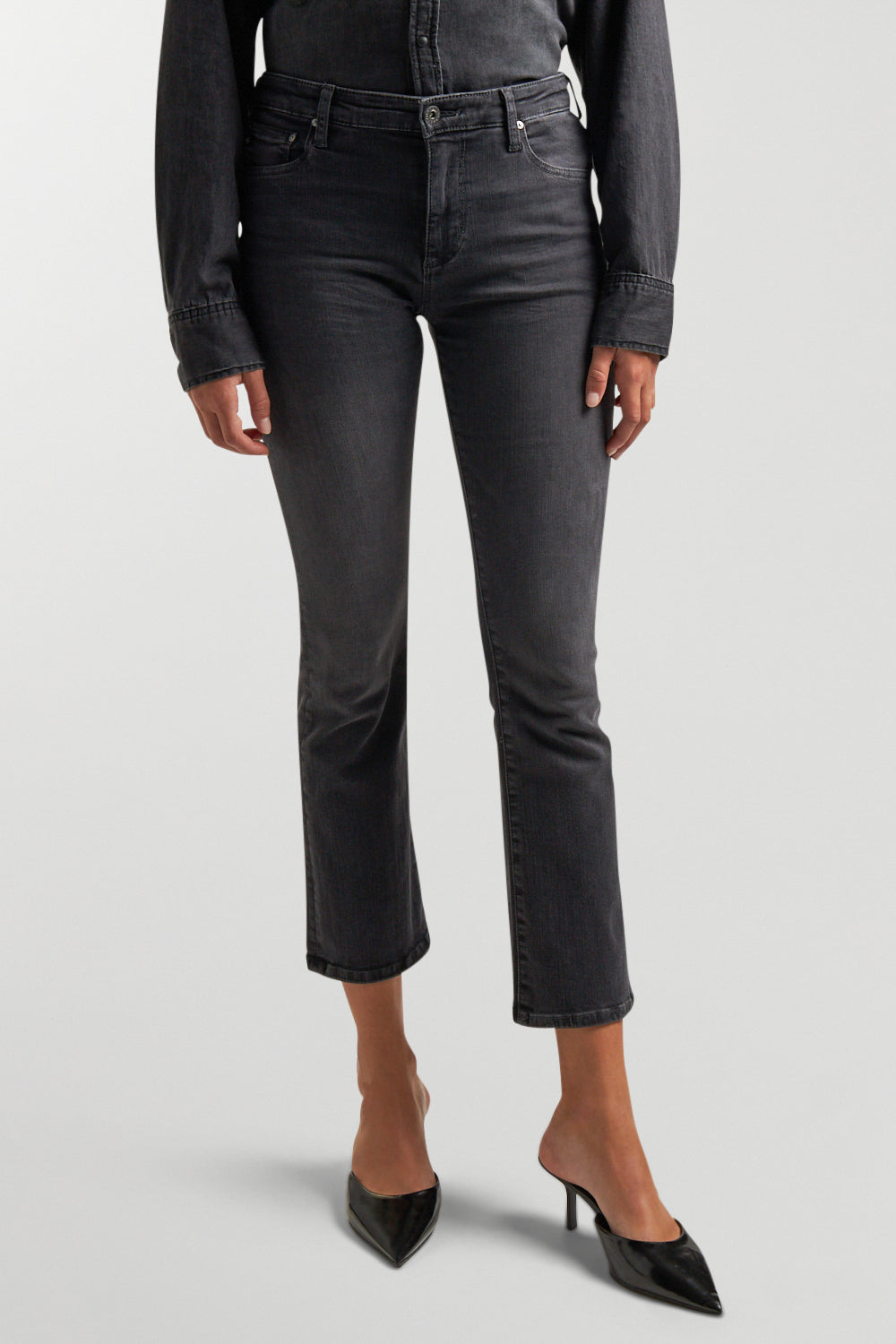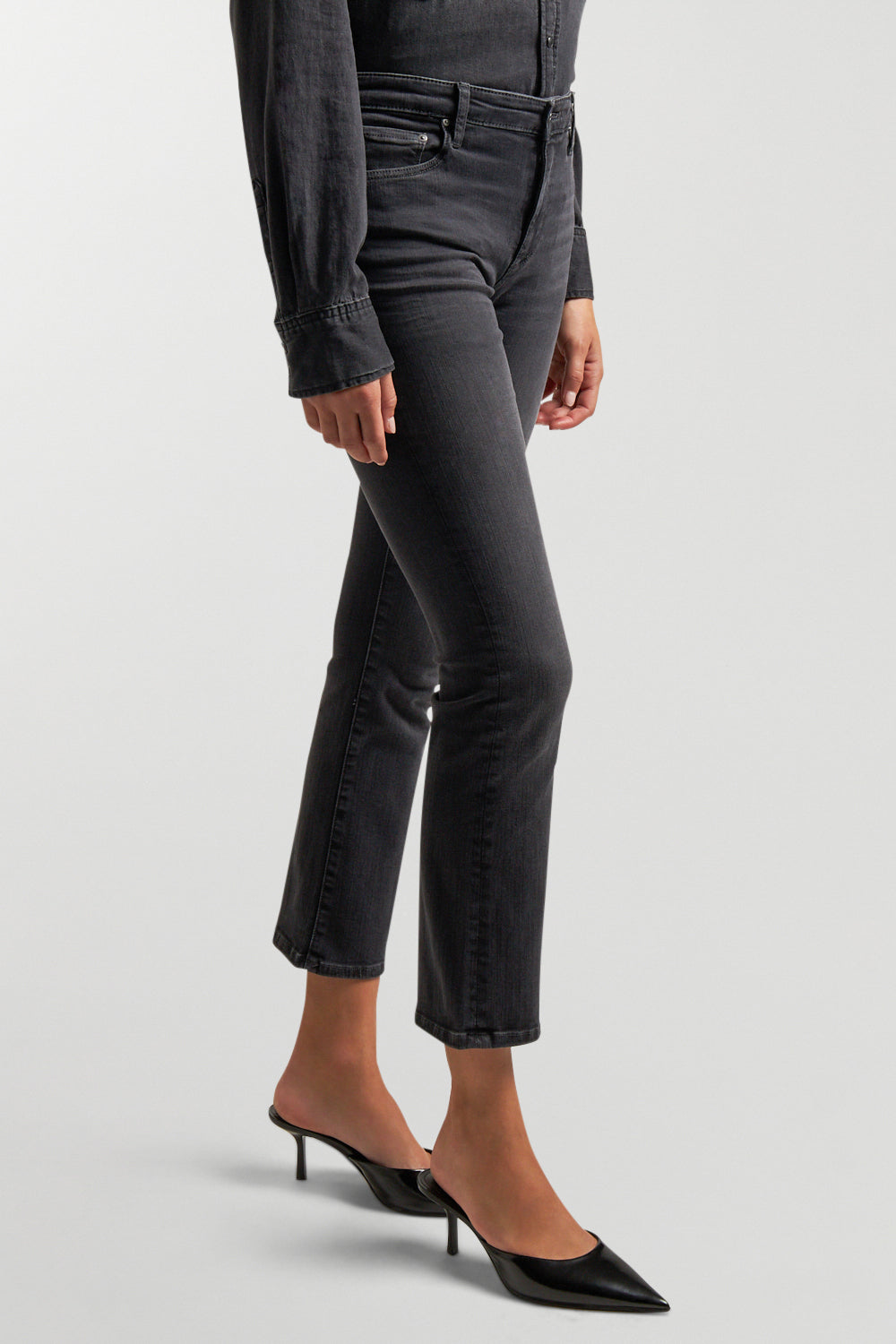 The Jodi Crop is a high-rise flare jean that offers a sleek, straight fit through the hips and thighs, leading to a subtle, slightly flared silhouette. This modern cropped style delivers a chic, contemporary look, perfect for an effortlessly stylish and bold outfit.