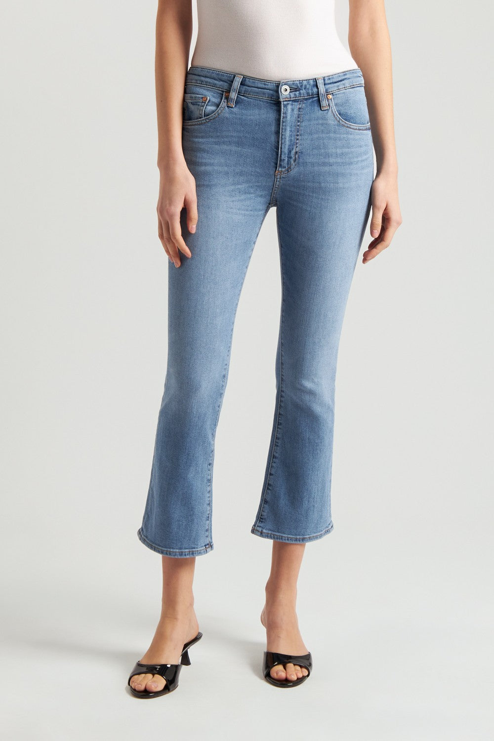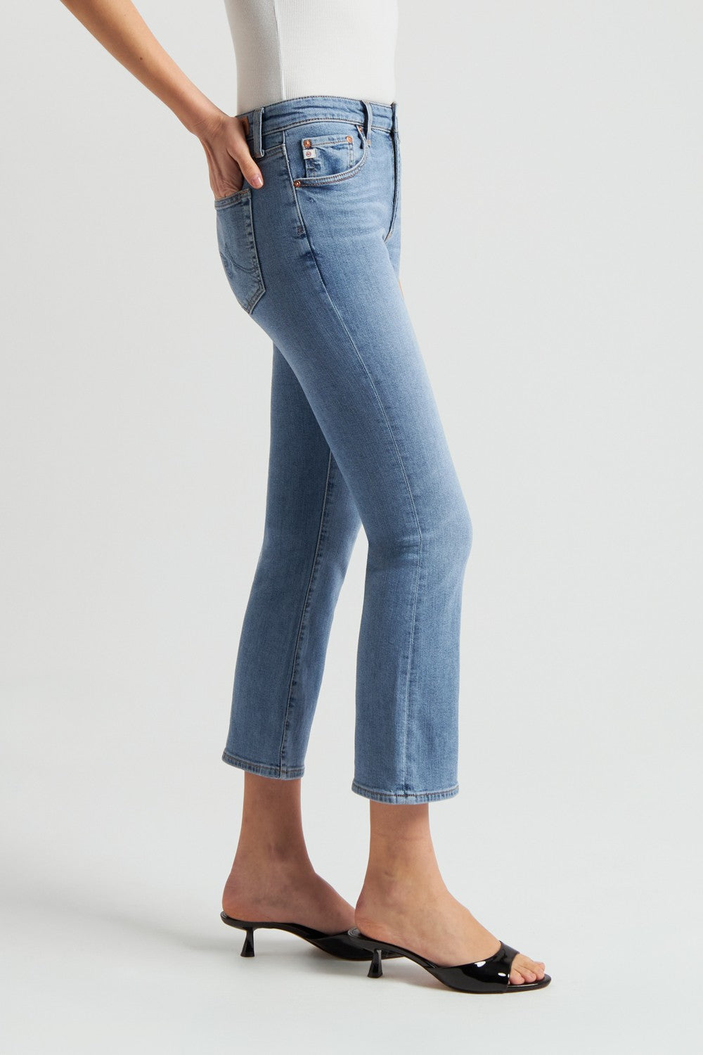 The Jodi Crop is a high-rise flare jean that offers a sleek, straight fit through the hips and thighs, leading to a subtle, slightly flared silhouette. This modern cropped style delivers a chic, contemporary look, perfect for an effortlessly stylish and bold outfit.