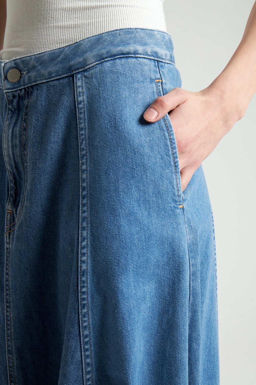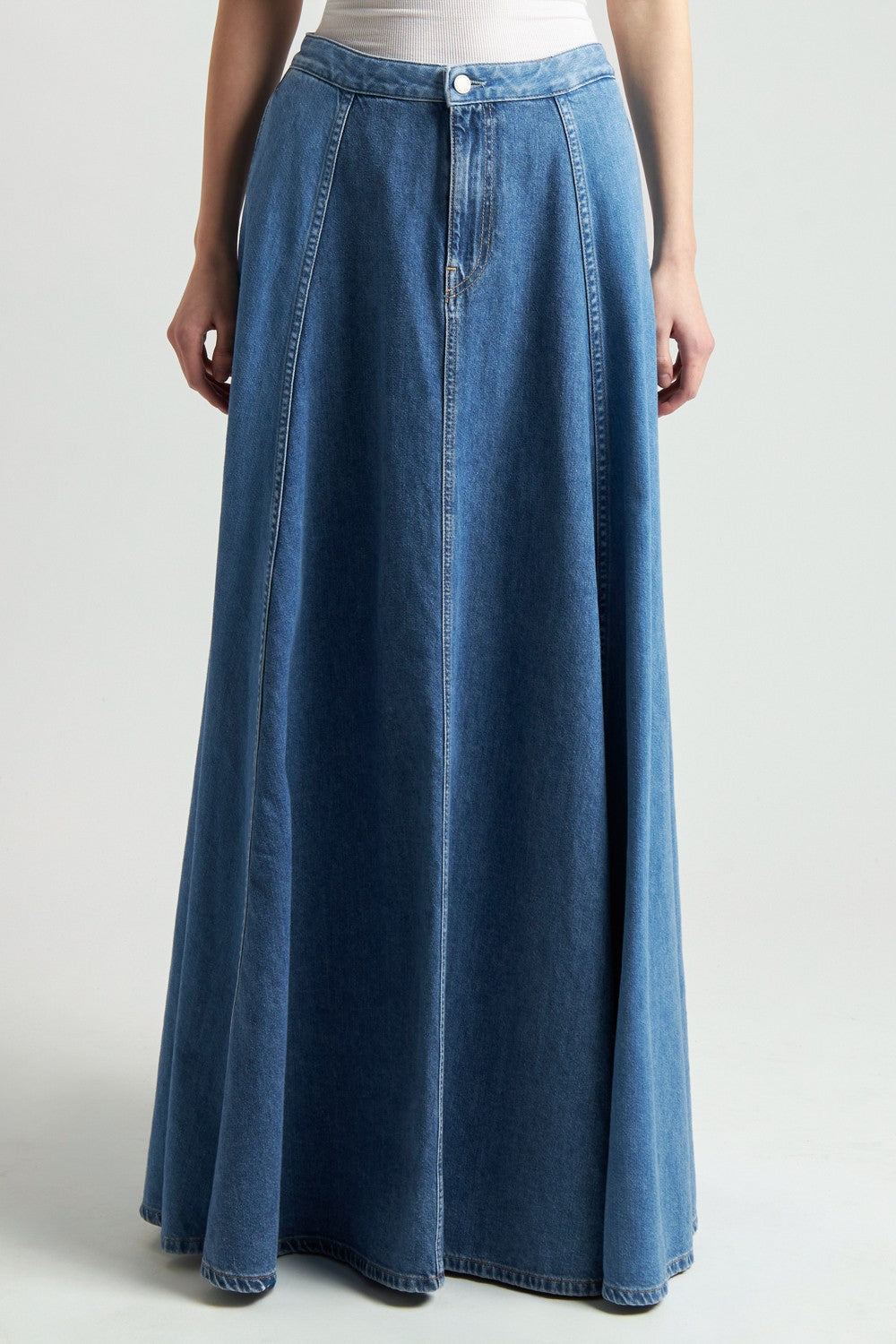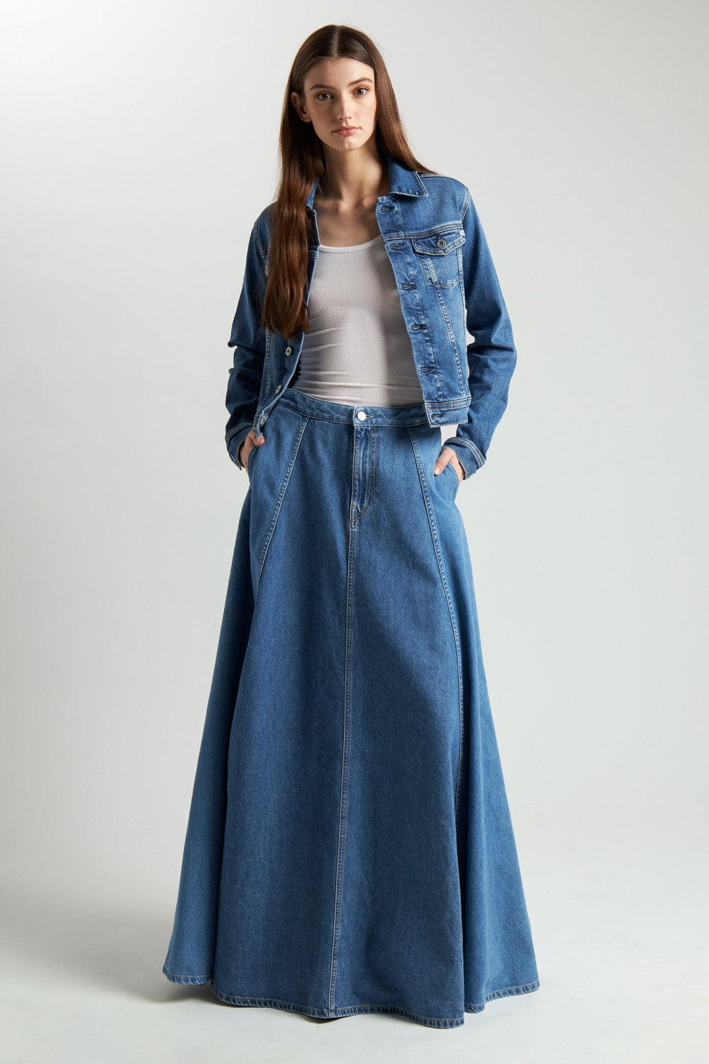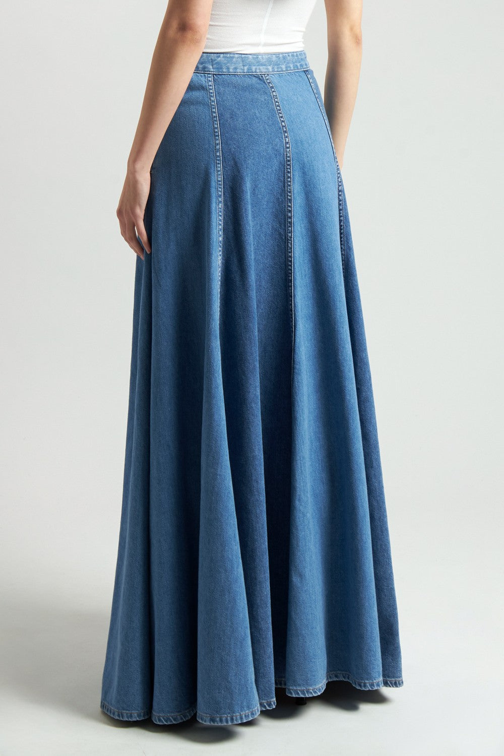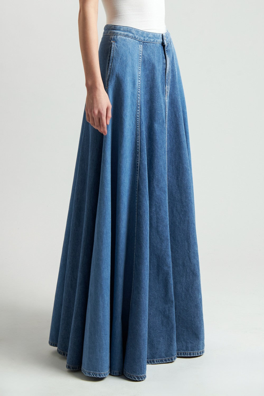 This ultra-long denim skirt boasts an abundance of fabric, creating soft waves that give it a highly feminine tone and a fluid, sinuous movement. A fresh piece for a romantic woman who doesnt compromise on practicality, it combines elegance with effortless style.