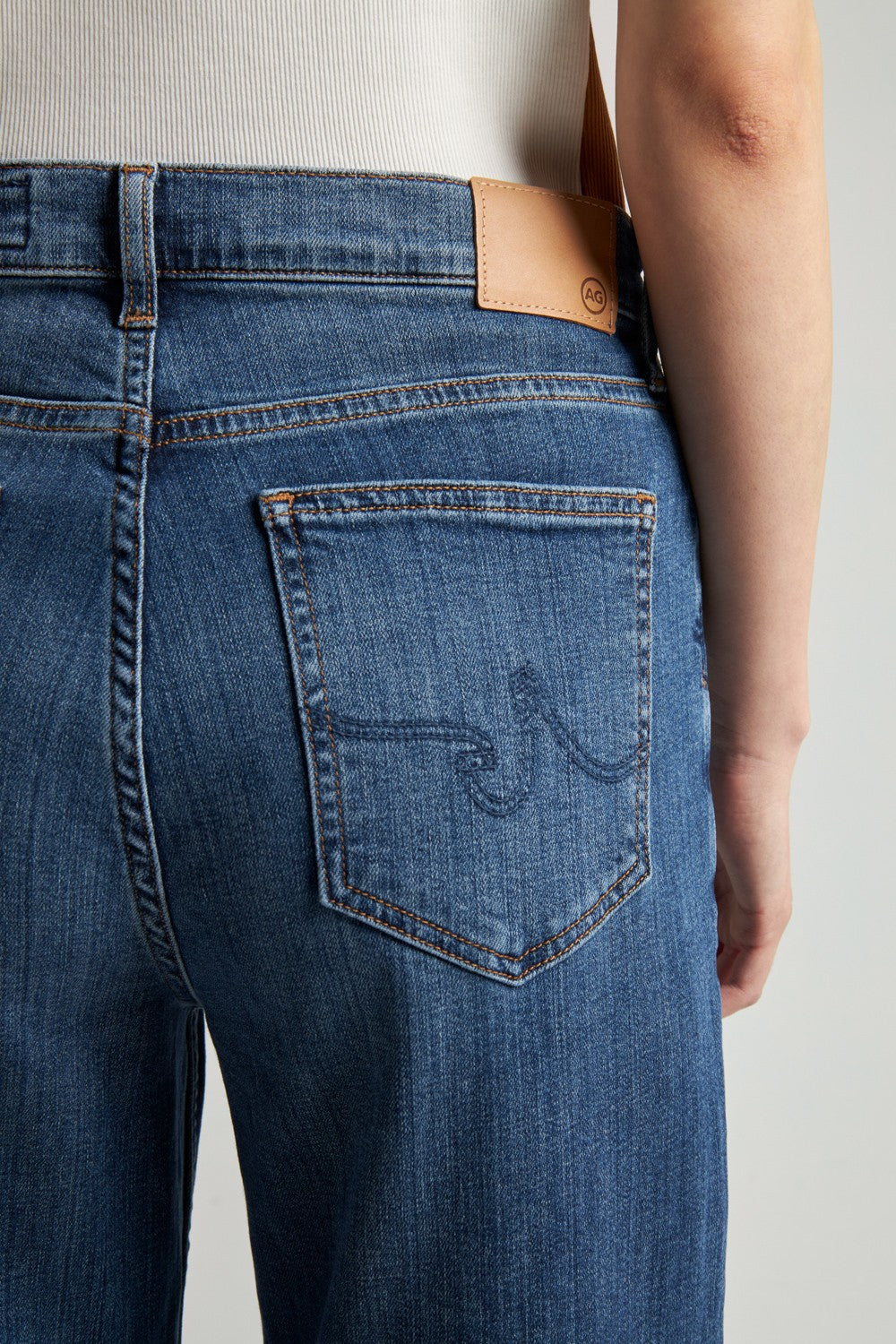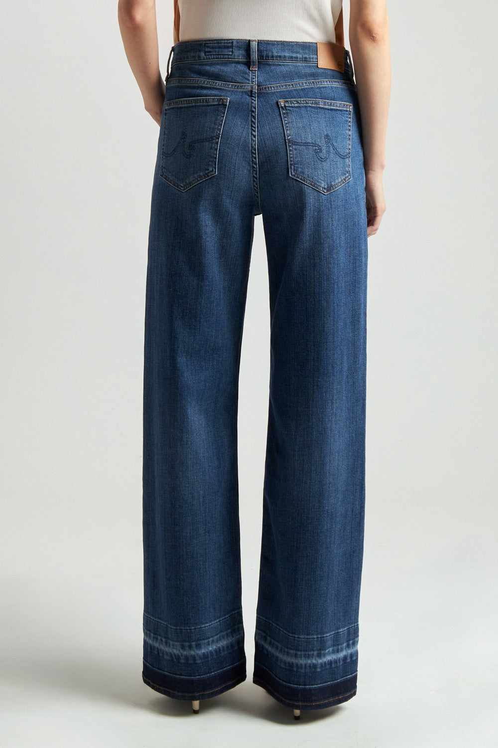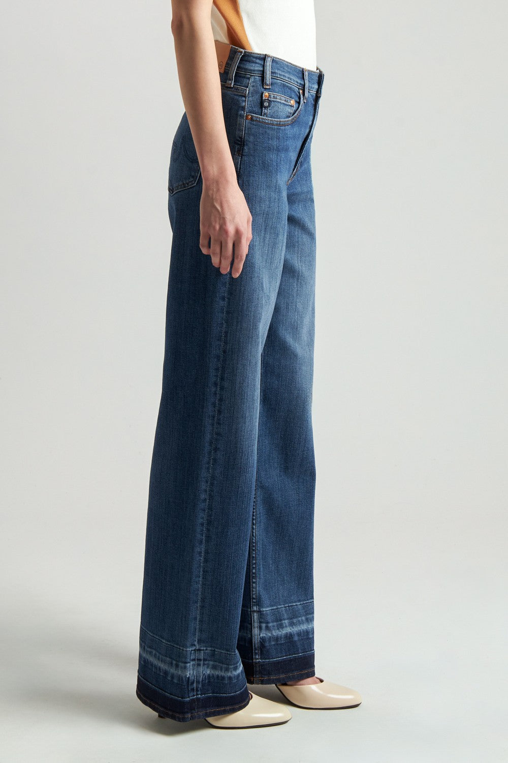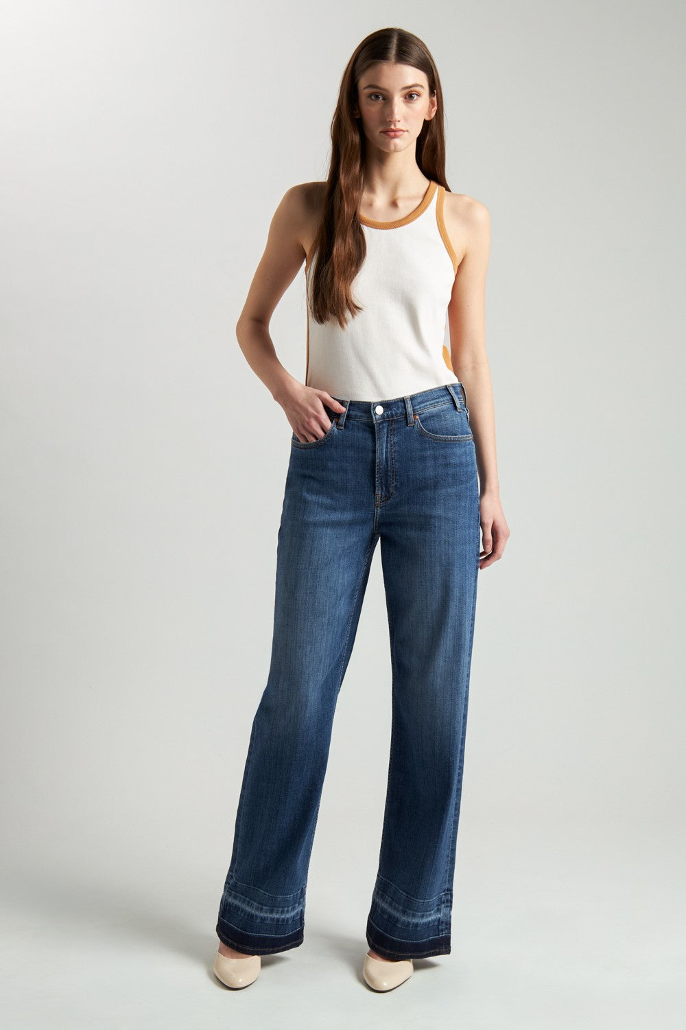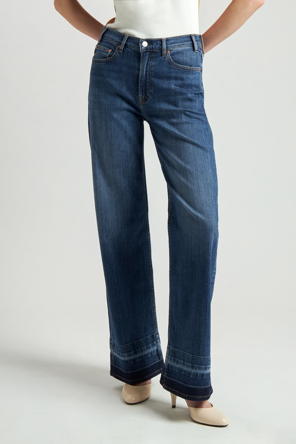 Wide-leg jeans with a comfortable fit at the waist and hips, falling softly from thigh to hem. Designed with a mid-rise waist and a classic zip-and-button closure, their slightly extended length lets the fabric drape effortlessly over the foot. Easy to style: wear them with flats for everyday comfort, or pair with heels for a chic, contemporary twist.