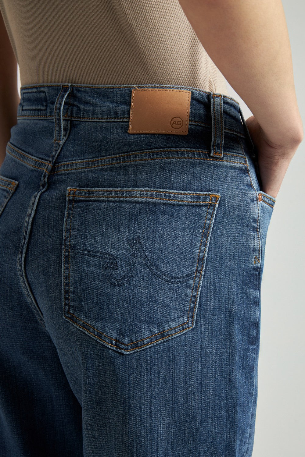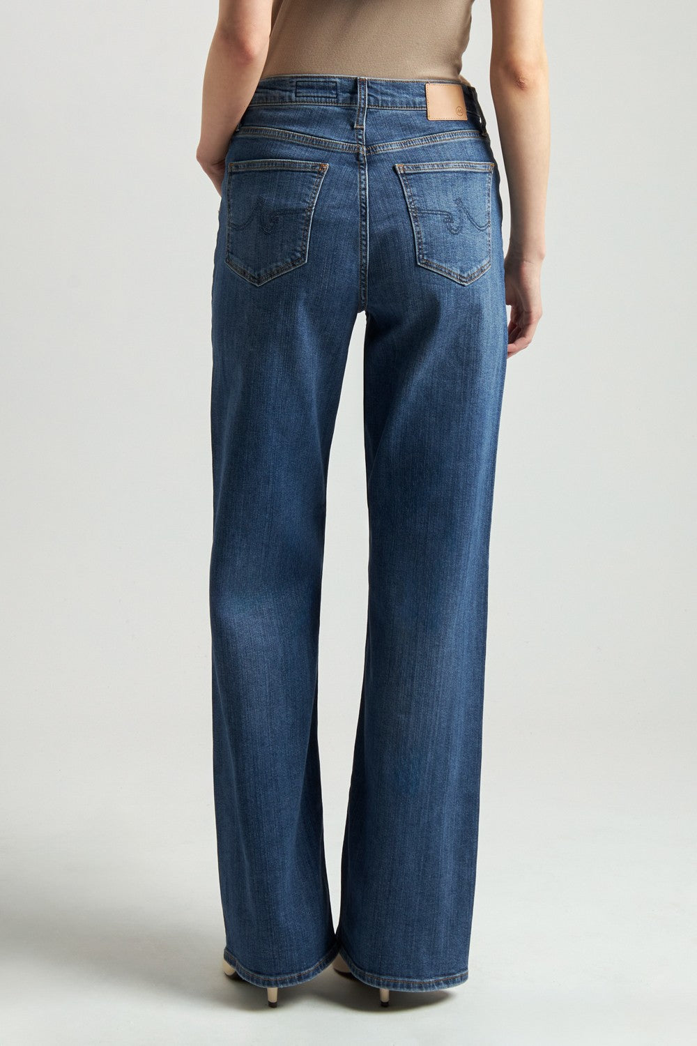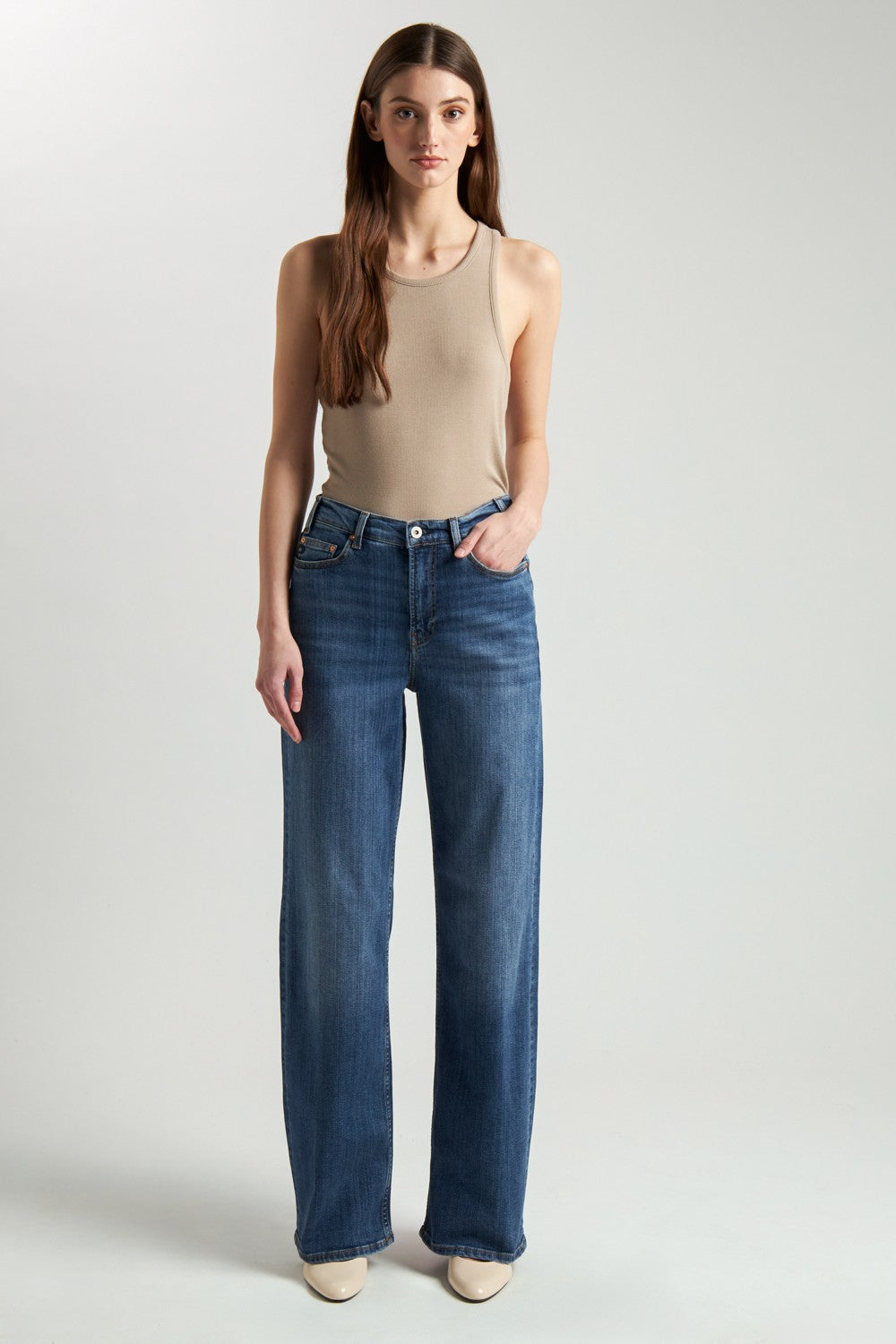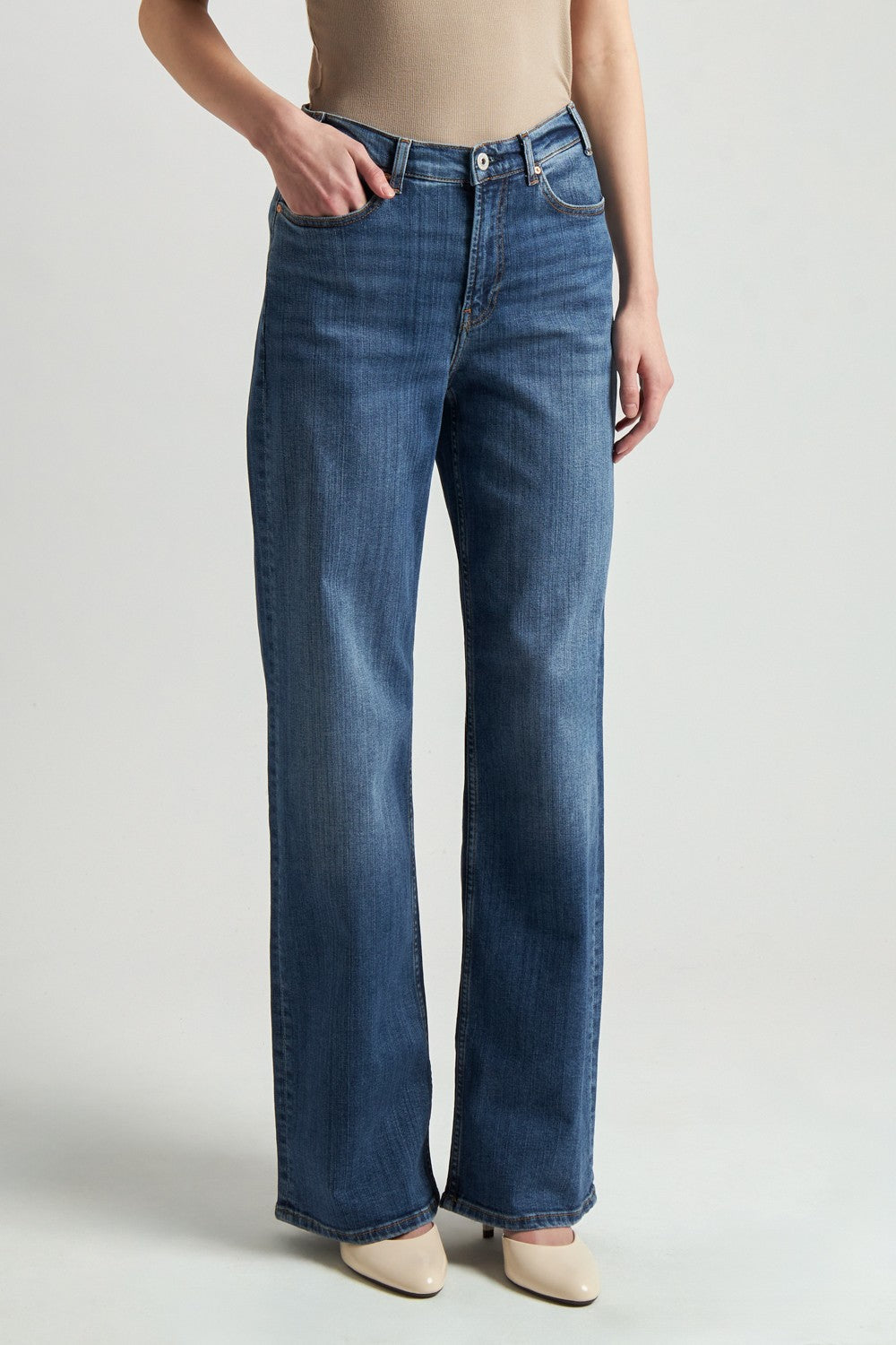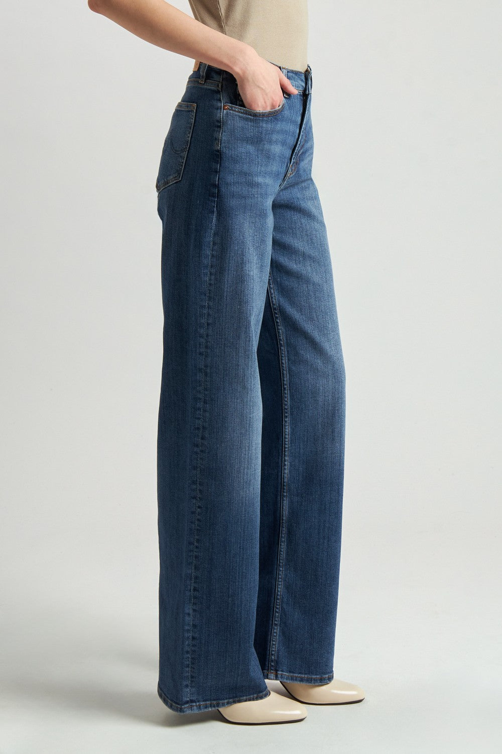Wide-leg jeans with a comfortable fit at the waist and hips, falling softly from thigh to hem. Designed with a mid-rise waist and a classic zip-and-button closure, their slightly extended length lets the fabric drape effortlessly over the foot. Easy to style: wear them with flats for everyday comfort, or pair with heels for a chic, contemporary twist.