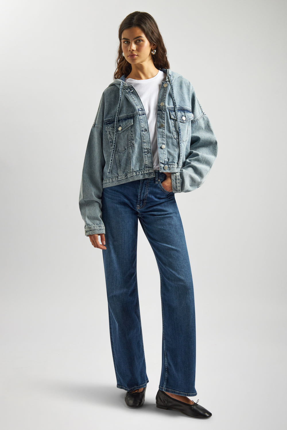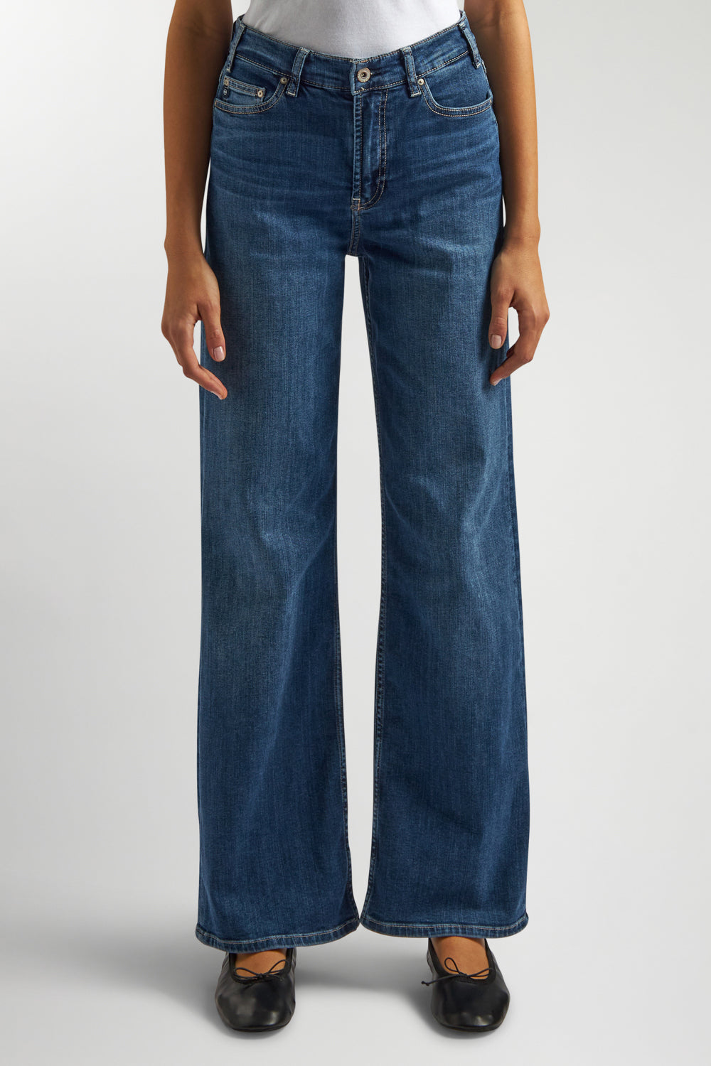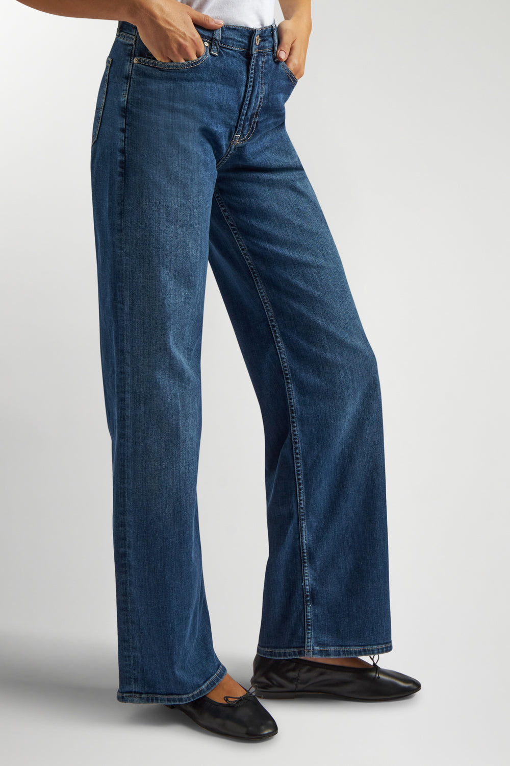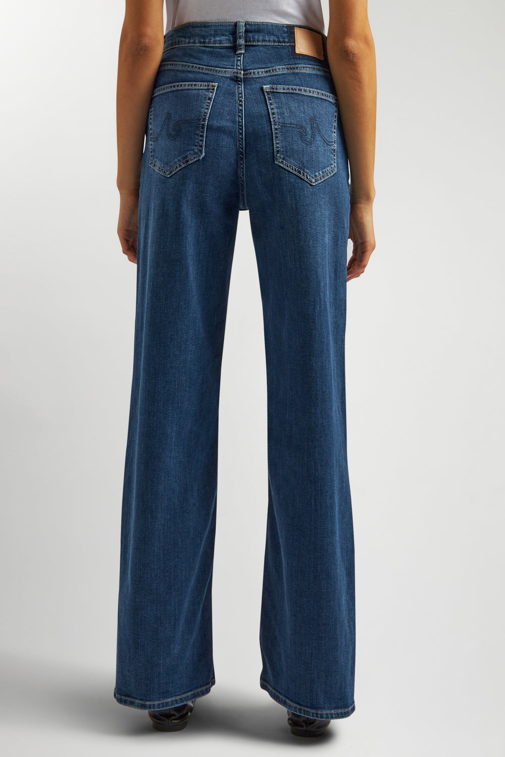 Wide-leg jeans with a comfortable fit at the waist and hips, falling softly from thigh to hem. Designed with a mid-rise waist and a classic zip-and-button closure, their slightly extended length lets the fabric drape effortlessly over the foot. Easy to style: wear them with flats for everyday comfort, or pair with heels for a chic, contemporary twist.