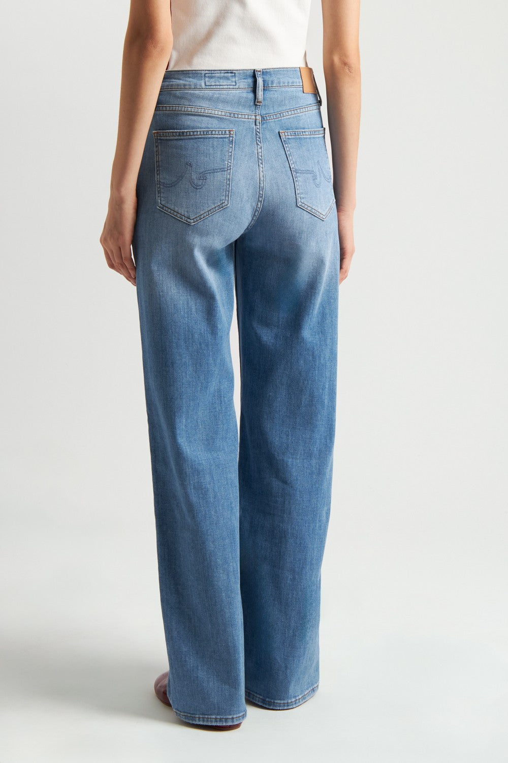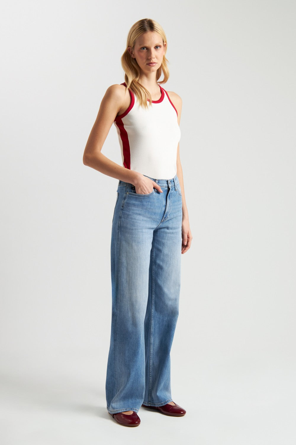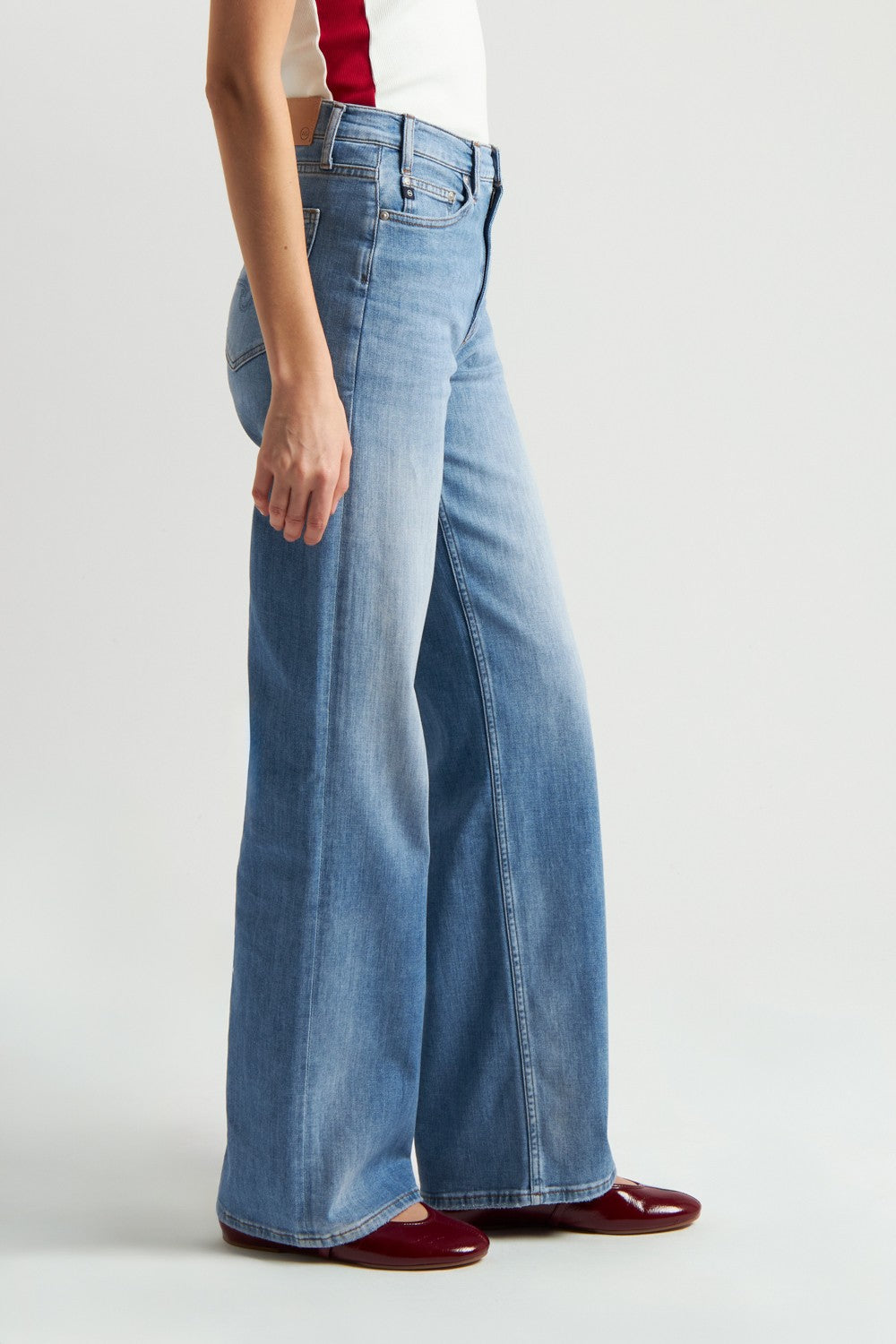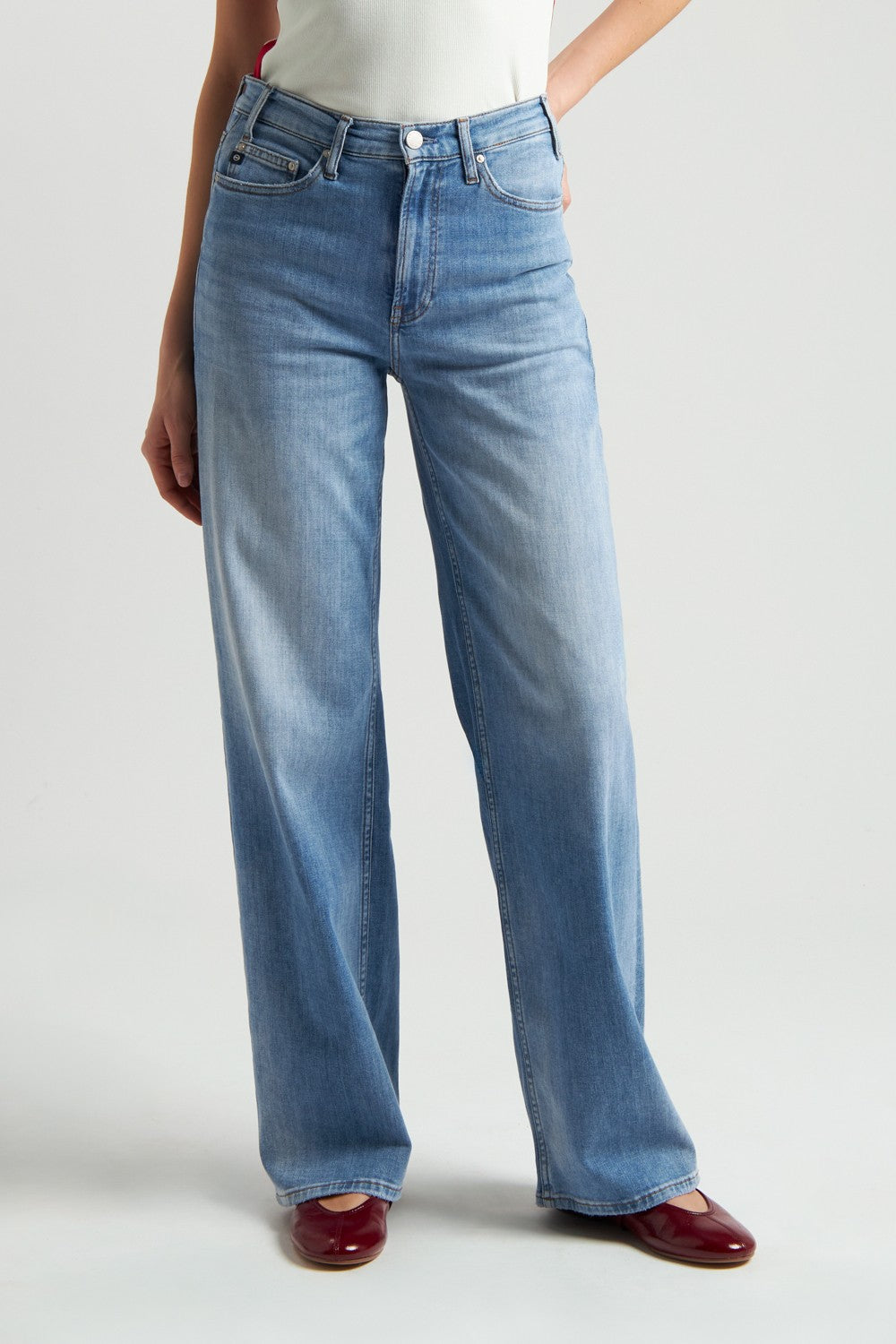 Wide-leg jeans with a comfortable fit at the waist and hips, falling softly from thigh to hem. Designed with a mid-rise waist and a classic zip-and-button closure, their slightly extended length lets the fabric drape effortlessly over the foot. Easy to style: wear them with flats for everyday comfort, or pair with heels for a chic, contemporary twist.