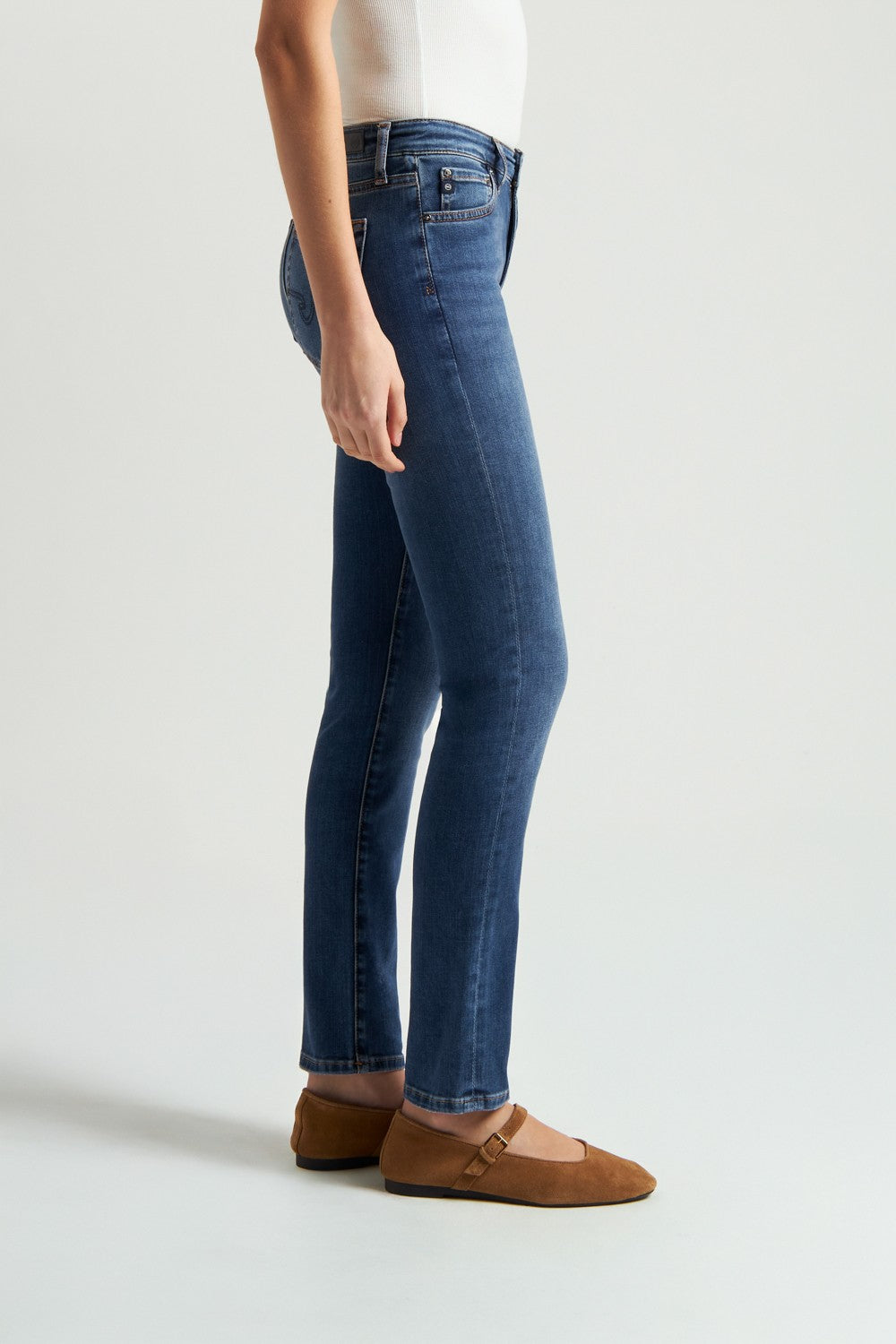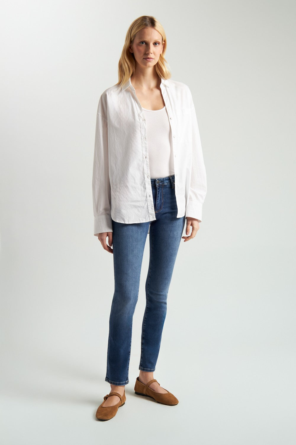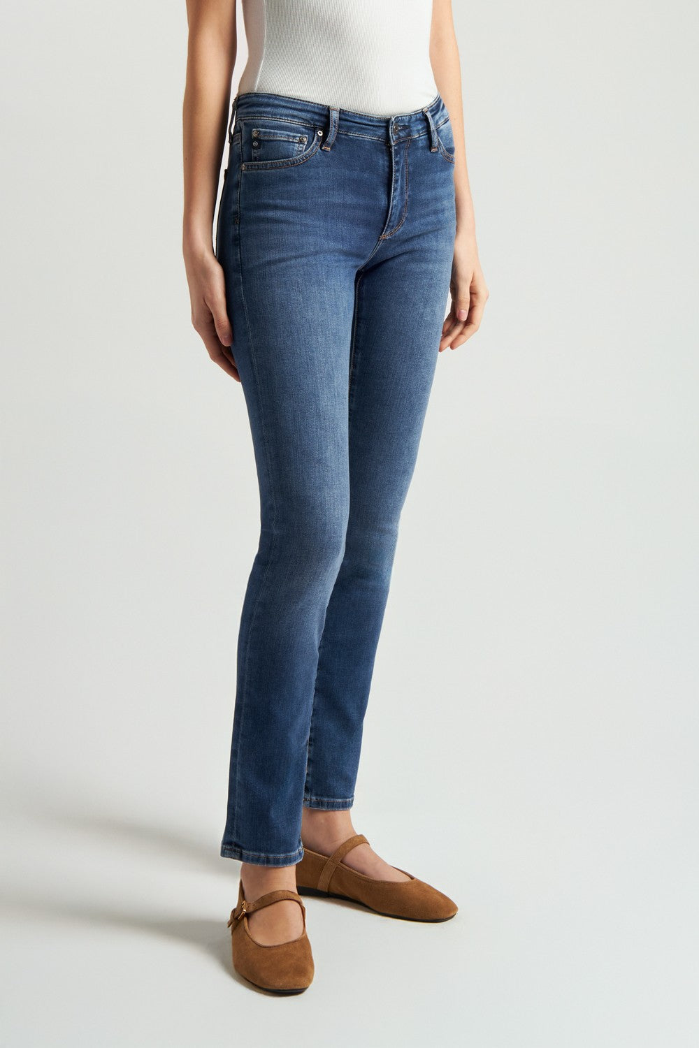 The Prima is a stylish mid-rise cigarette jean that flatters the hips with a fitted silhouette and gently tapers at the legs for a sleek, modern look. Featuring subtle fading and whiskering, these jeans offer a timeless, worn-in appeal that complements any wardrobe.